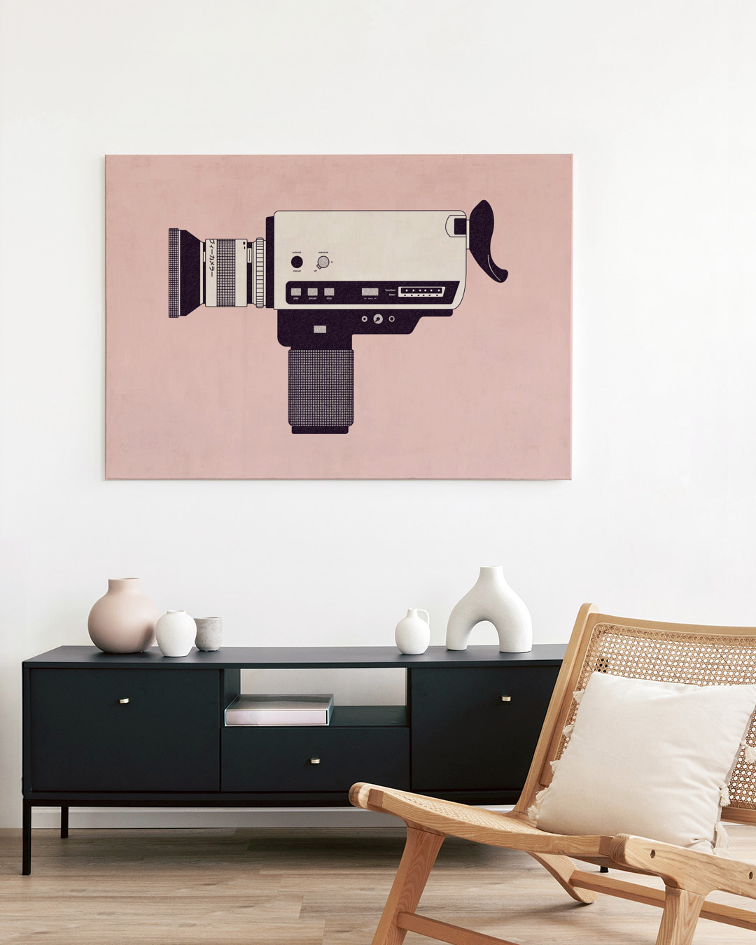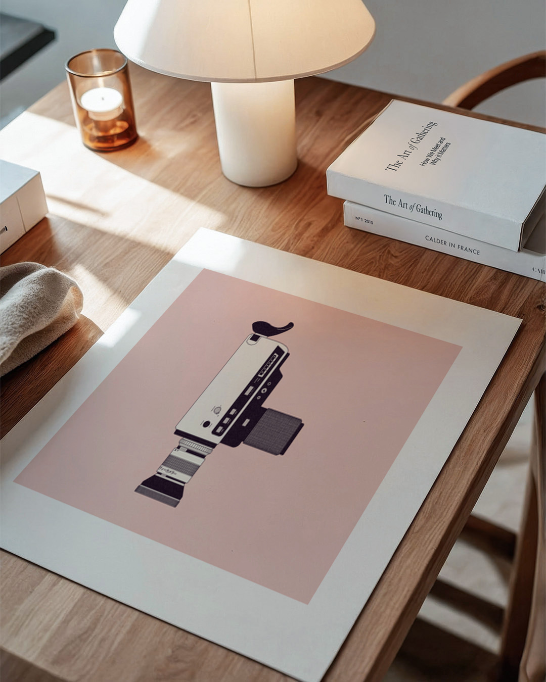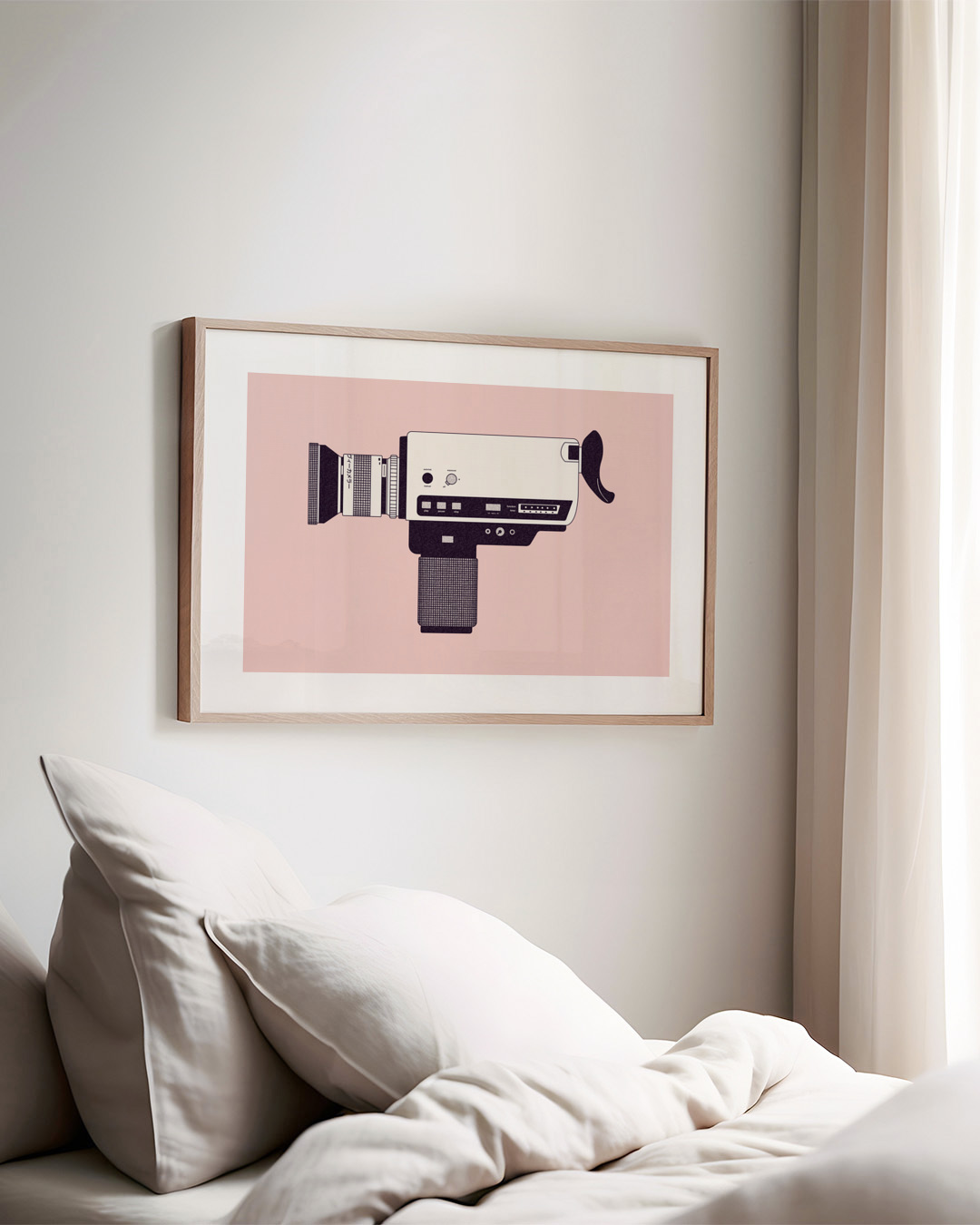 Florent Bodarts illustration visar en klassisk Super 8-kamera. Mot en rosa bakgrund hyllar denna konst vintage filmutrustning och fångar nostalgian av traditionell filmproduktion.