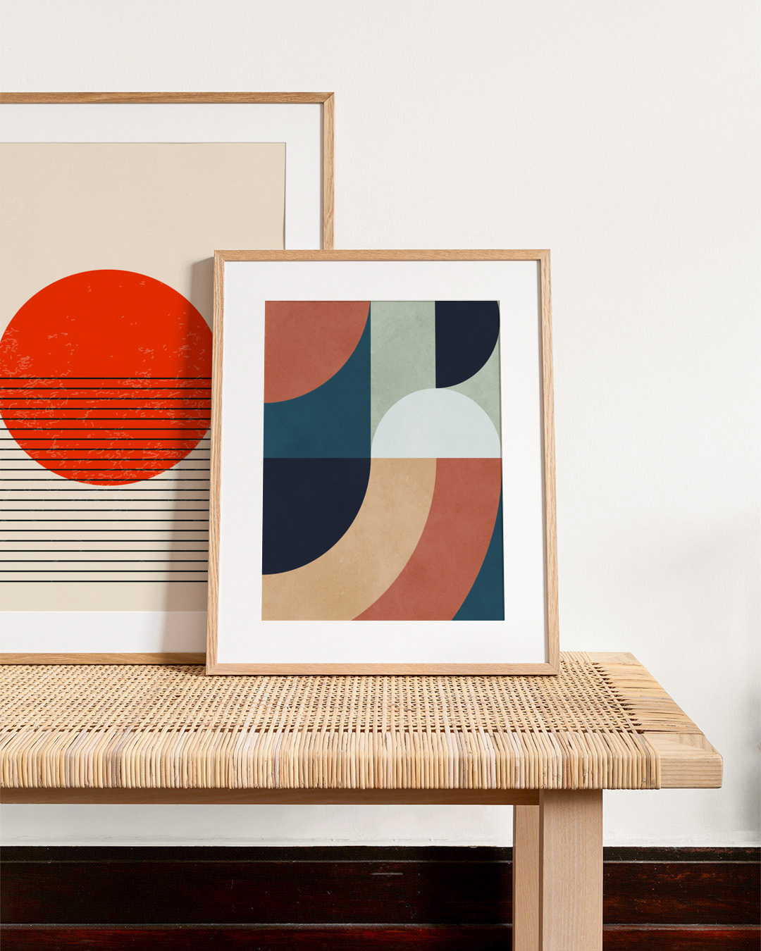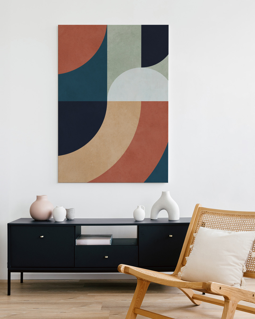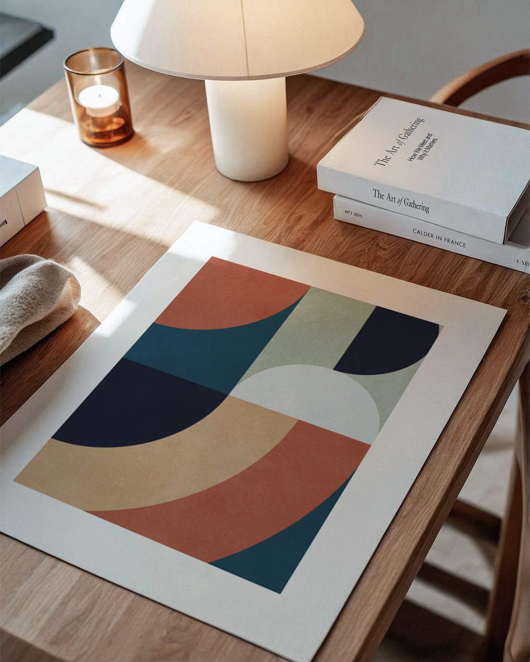 Ein auffälliger geometrischer Druck mit harmonischen Kreisen und kühnen Formen in den Farben Orange, Türkis und Beige. Perfekt, um modernen Flair in jeden Raum zu bringen.