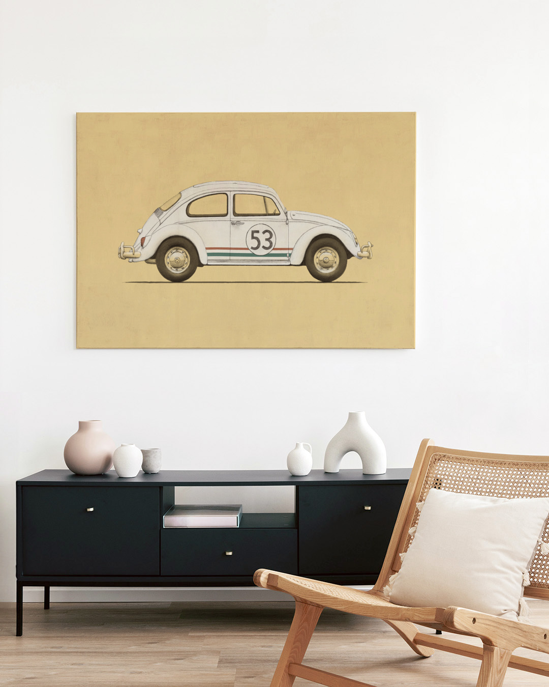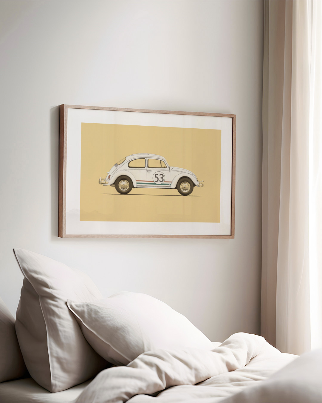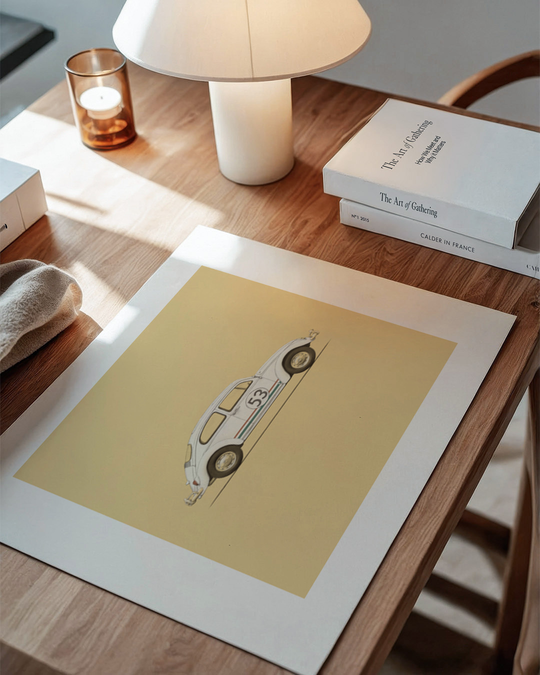 Dieses Vintage-Grafikdesign von Florent Bodart zeigt einen klassischen Käfer mit der Nummer 53, bekannt als Herbie. Das Kunstwerk zeichnet sich durch einen minimalistischen Stil mit einem beigen Hintergrund aus, der die nostalgische Essenz des ikonischen Fahrzeugs einfängt.