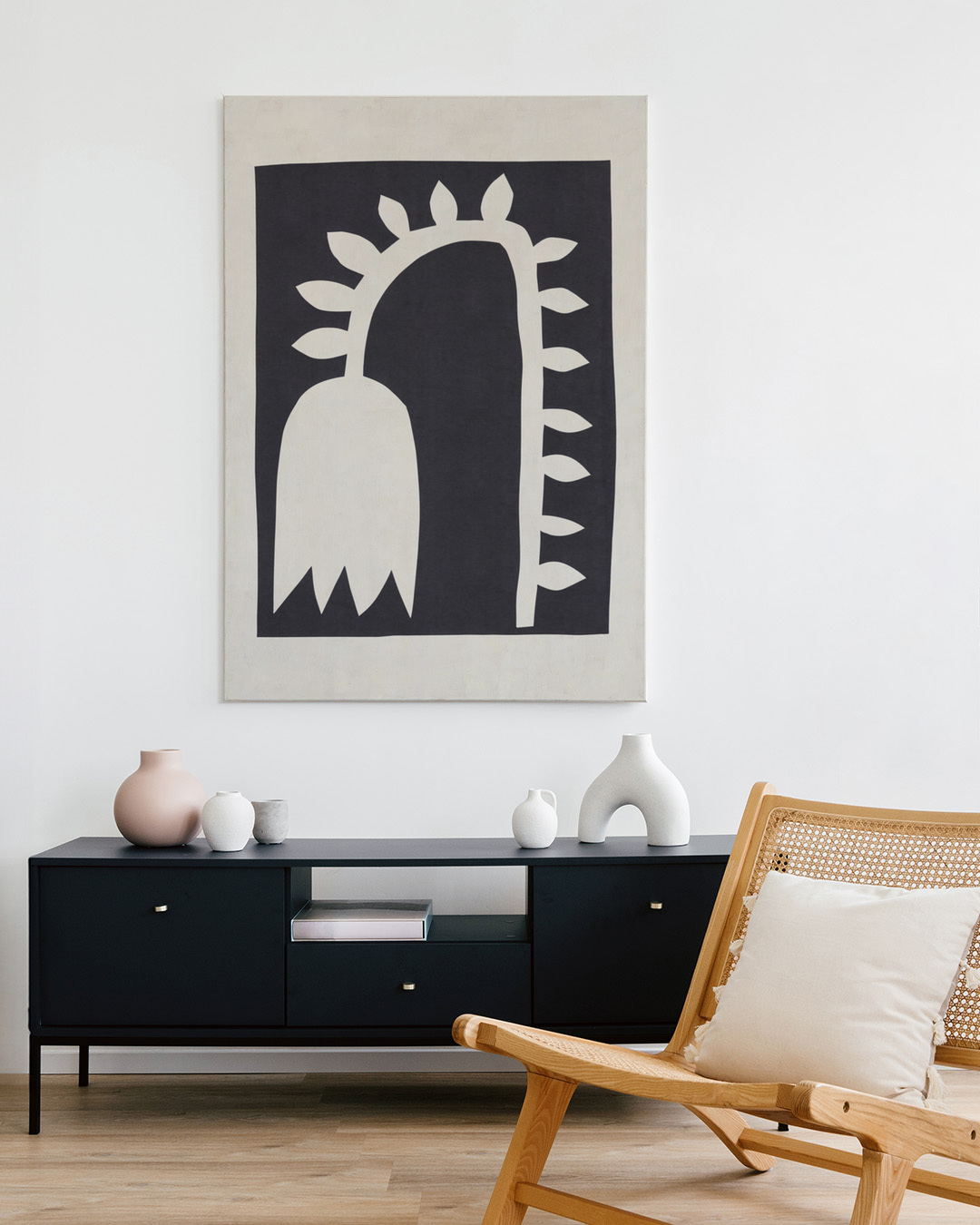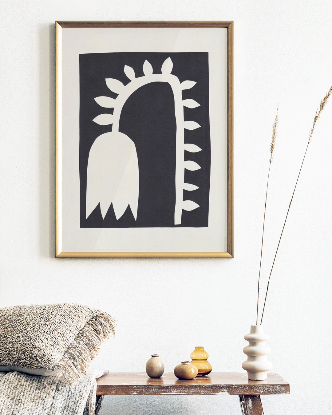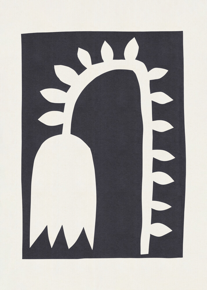 Ein auffälliger grafischer Kunstdruck, der eine stilisierte schwarzweiße Blume vor einem kontrastreichen Hintergrund zeigt. Das monochrome Design betont die Einfachheit und Eleganz der Blume.