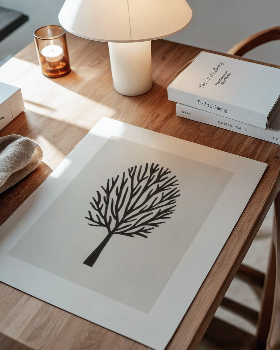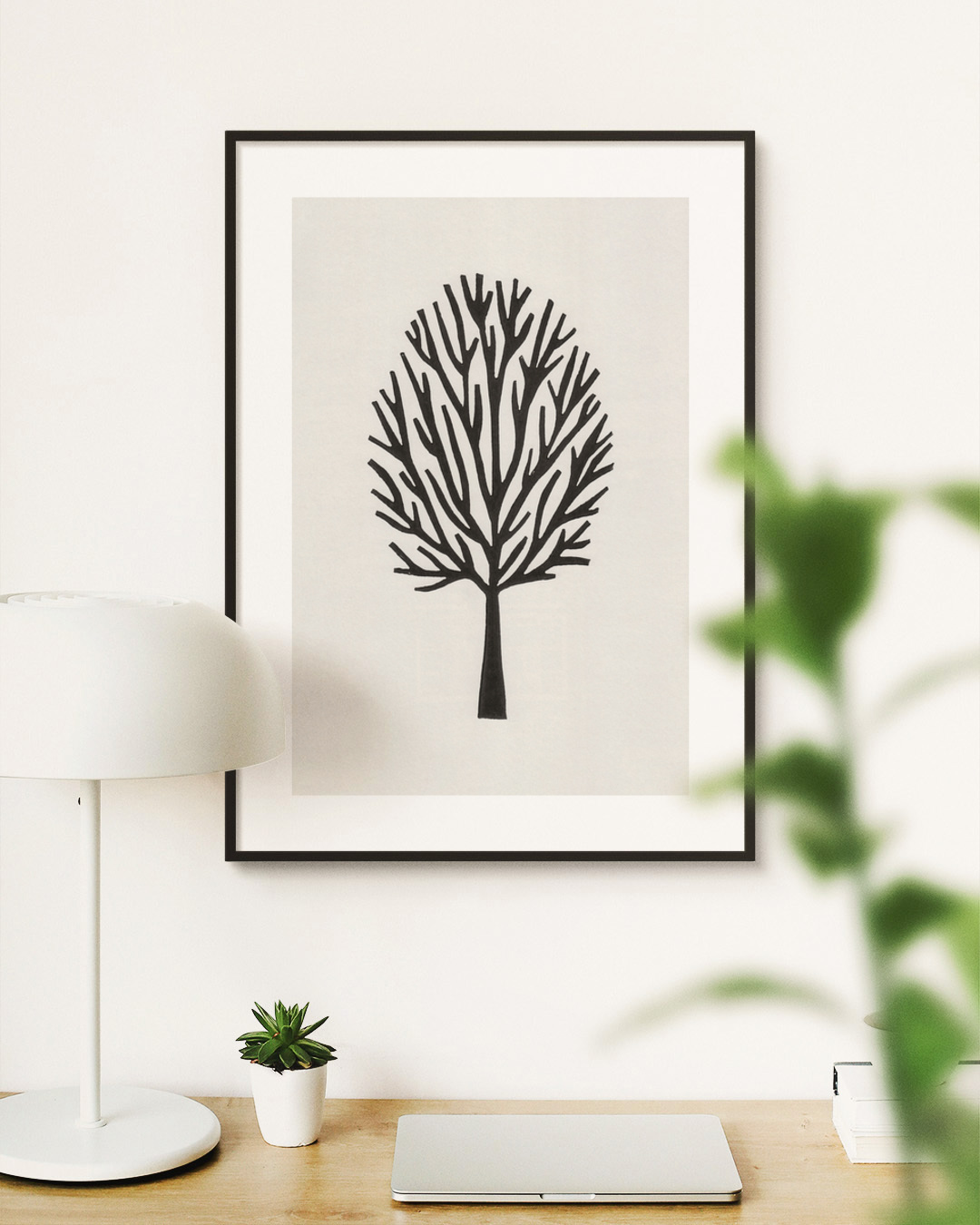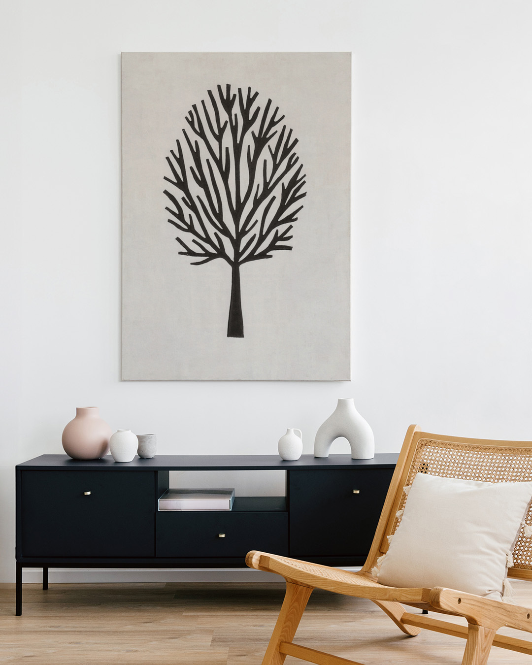 Entdecken Sie die Eleganz eines minimalistischen schwarzen stilisierten Baumes mit komplizierten Zweigen, die sich gegen einen schlichten Hintergrund abheben, und ein ruhiges und durchdachtes Stück für jeden Innenraum bieten.