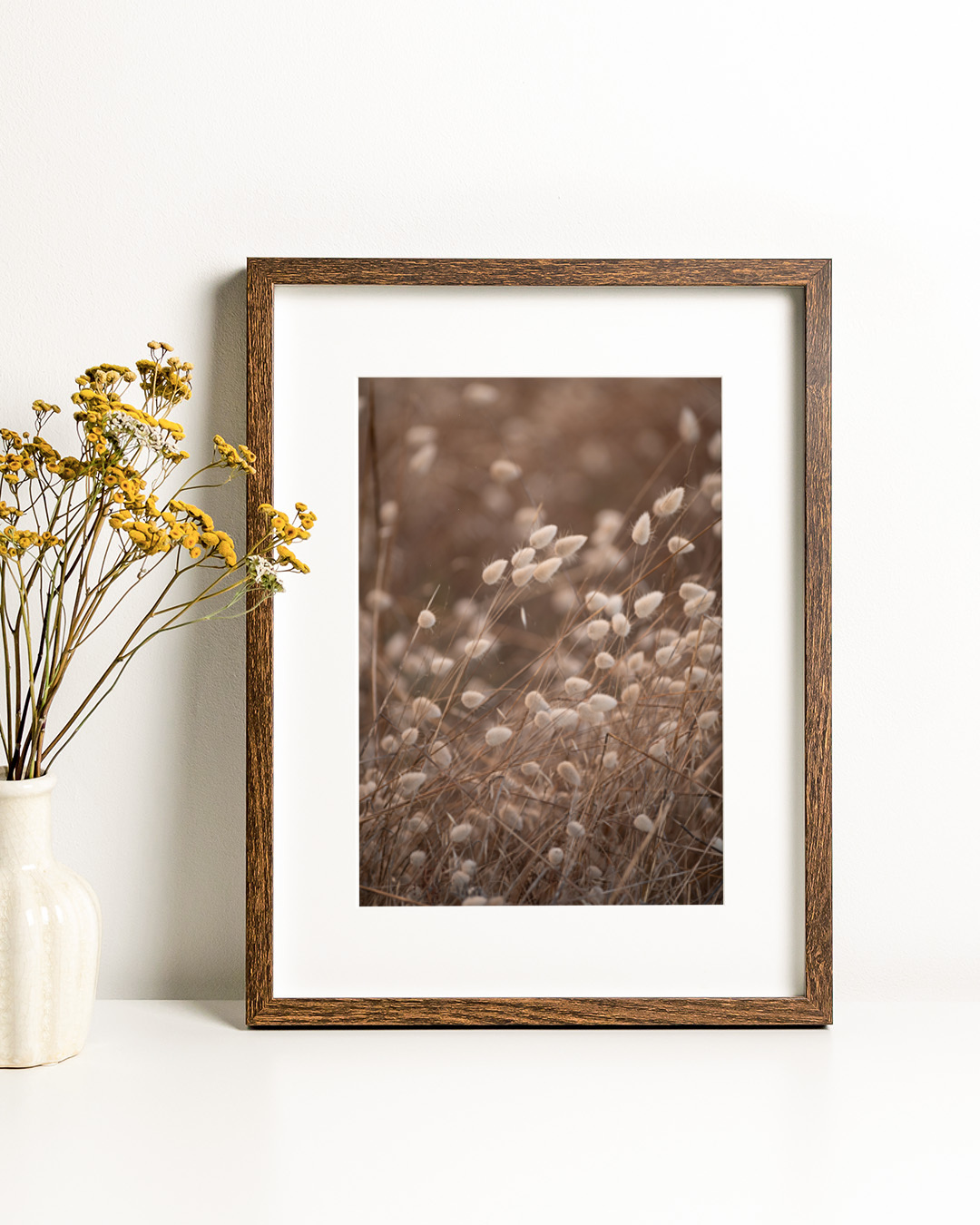 Ein wunderschönes Foto von Crystal Lynn Collins, das die zarten blühenden Rispen von Hasenschwanz (Lagurus ovatus) in einem Herbstfeld zeigt.