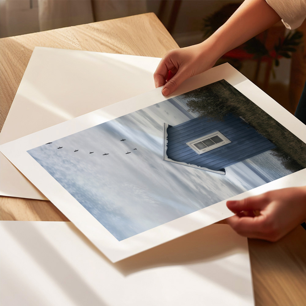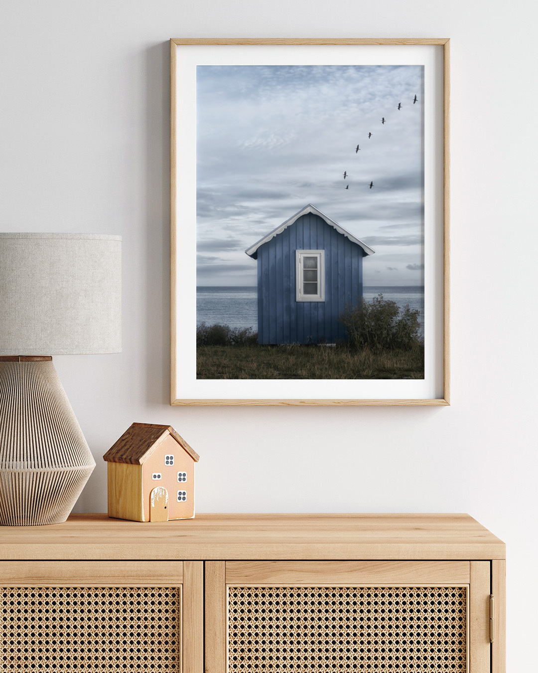 Ein ruhiges Foto eines einsamen blauen Strandhauses vor der Kulisse des ruhigen Meeres und Himmels, begleitet von fliegenden Vögeln. Ideal für Liebhaber ruhiger Küstenlandschaften.