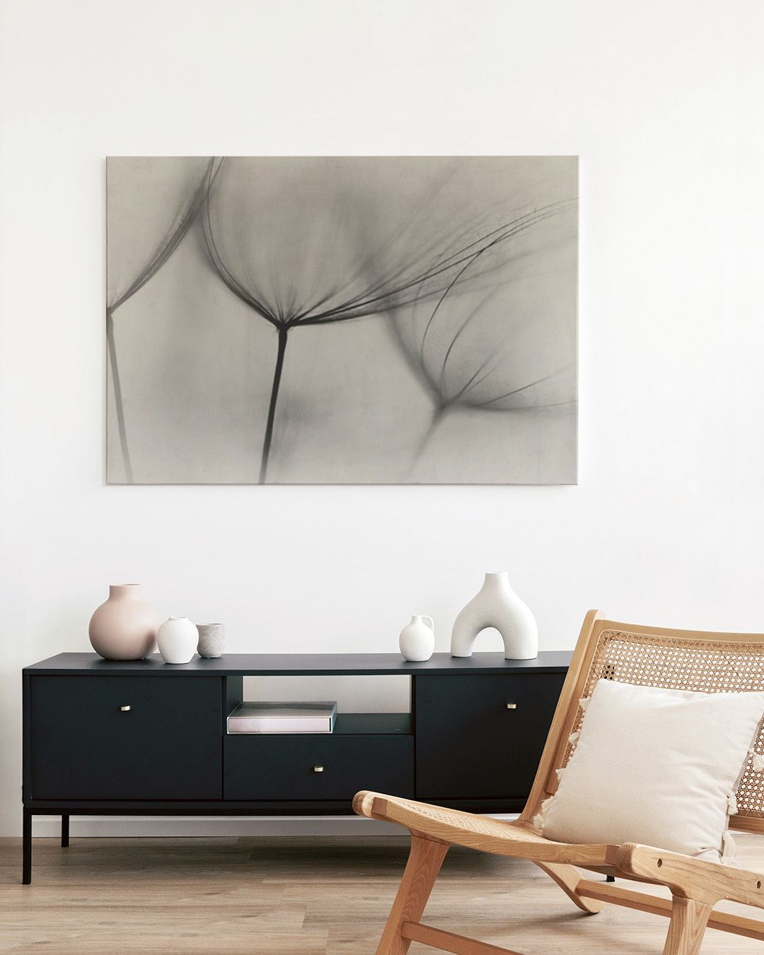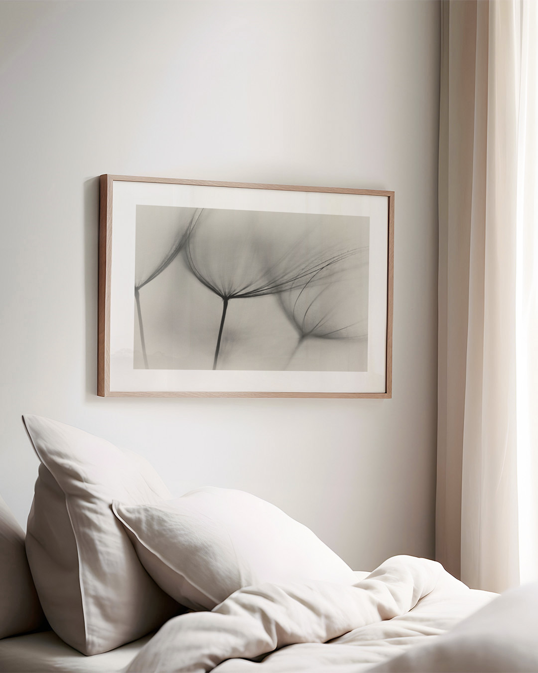 Die gespannte Leinwand wird in einen stilvollen Schattenfugenrahmen aus echtem Holz eingefasst, um einen eleganten Look und zusätzliche Dimension zu schaffen. Der Raum zwischen der Leinwand und dem Rahmen erzeugt einen schwebenden Effekt.