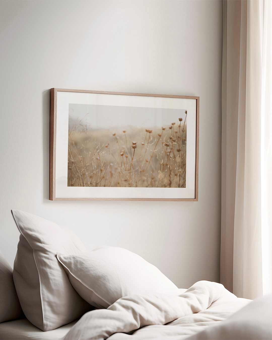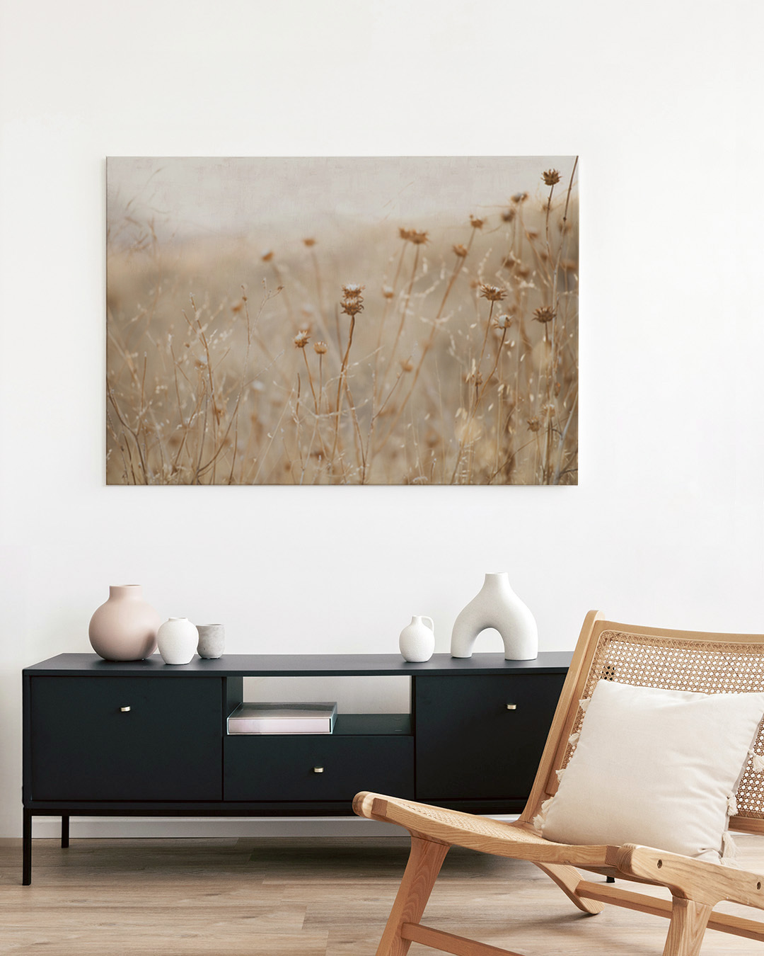 Die gespannte Leinwand wird in einen stilvollen Schattenfugenrahmen aus echtem Holz eingefasst, um einen eleganten Look und zusätzliche Dimension zu schaffen. Der Raum zwischen der Leinwand und dem Rahmen erzeugt einen schwebenden Effekt.