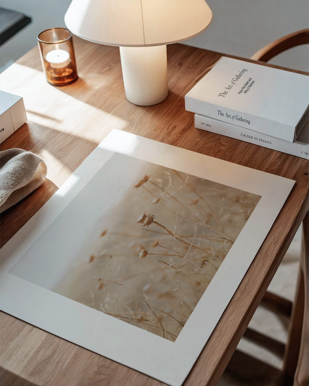 Dieses ruhige Foto von Crystal Lynn Collins zeigt eine Winterszene mit Disteln in einem nebligen Feld. Die sanften braunen und beigen Töne schaffen eine ruhige, botanische Atmosphäre.
