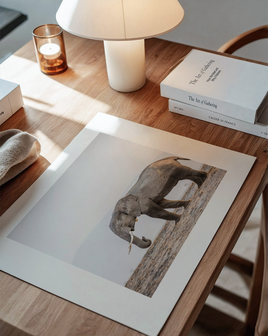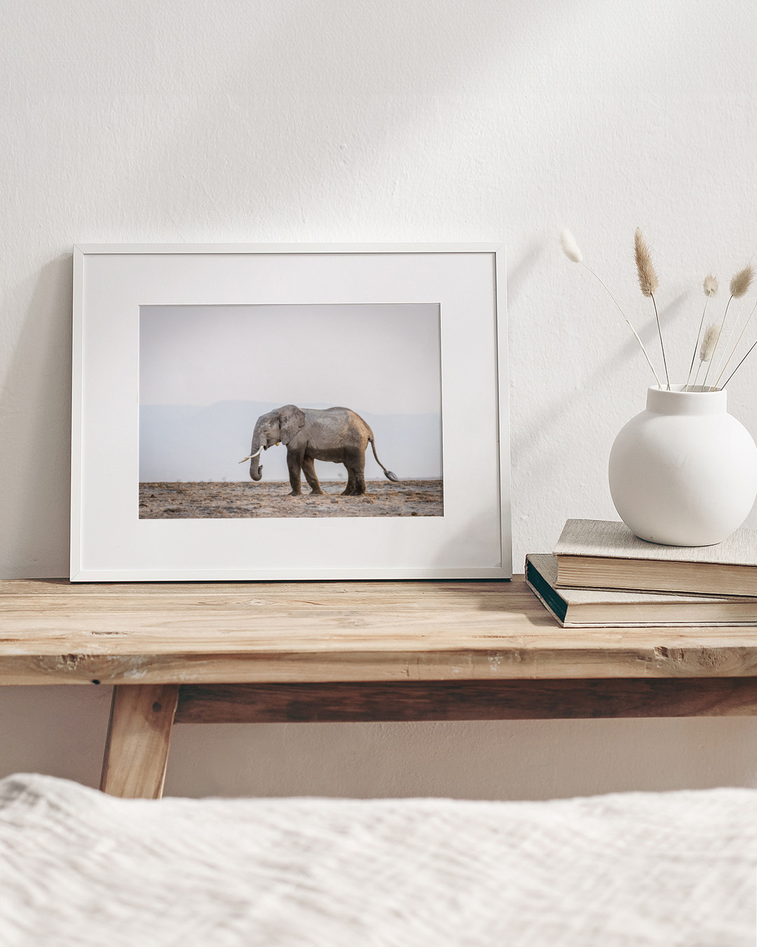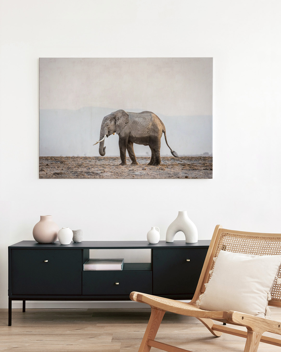 Ein einsamer Elefant durchquert eine weite, graue Savannenlandschaft und verkörpert die Majestät und Anmut des Tierreichs unter einem monochromen Himmel.