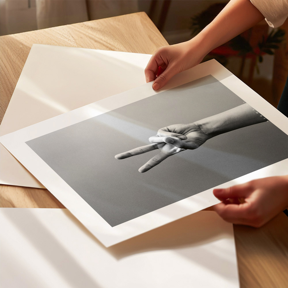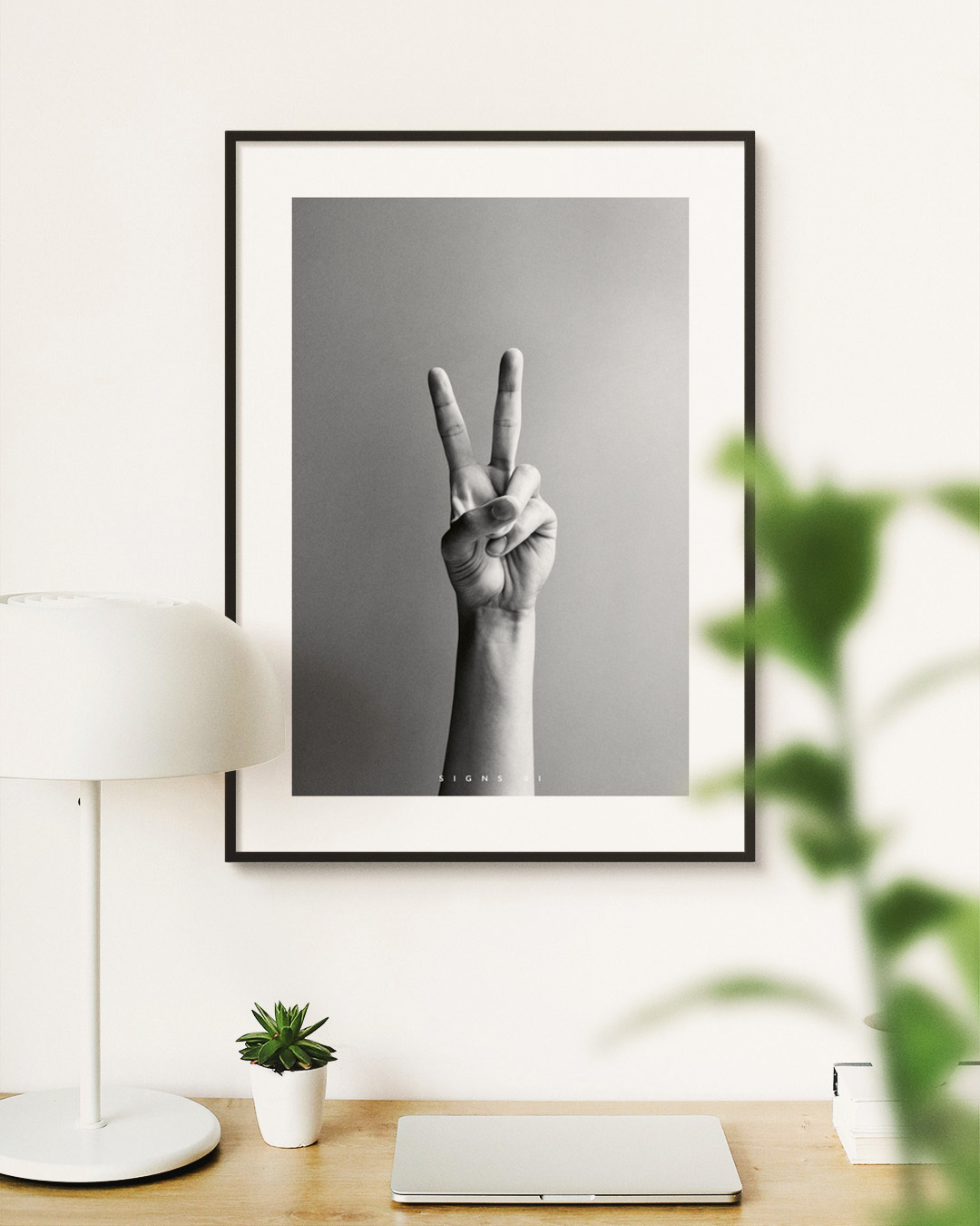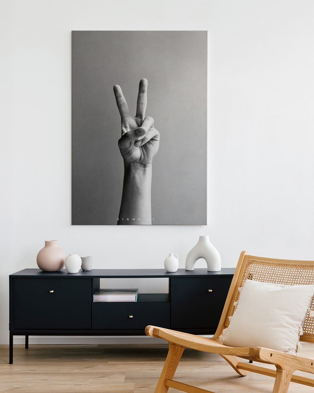 Eine auffällige schwarz-weiße Fotografie, die eine Hand zeigt, die ein Friedenszeichen macht. Diese minimalistische und kraftvolle Darstellung fängt die Essenz von Ruhe und Harmonie ein.