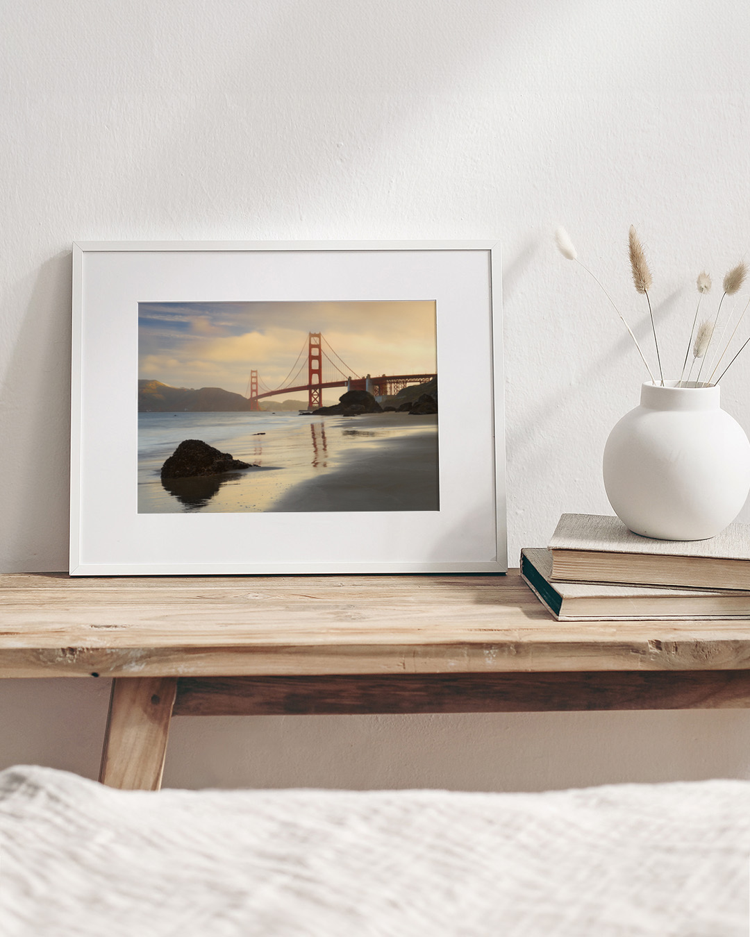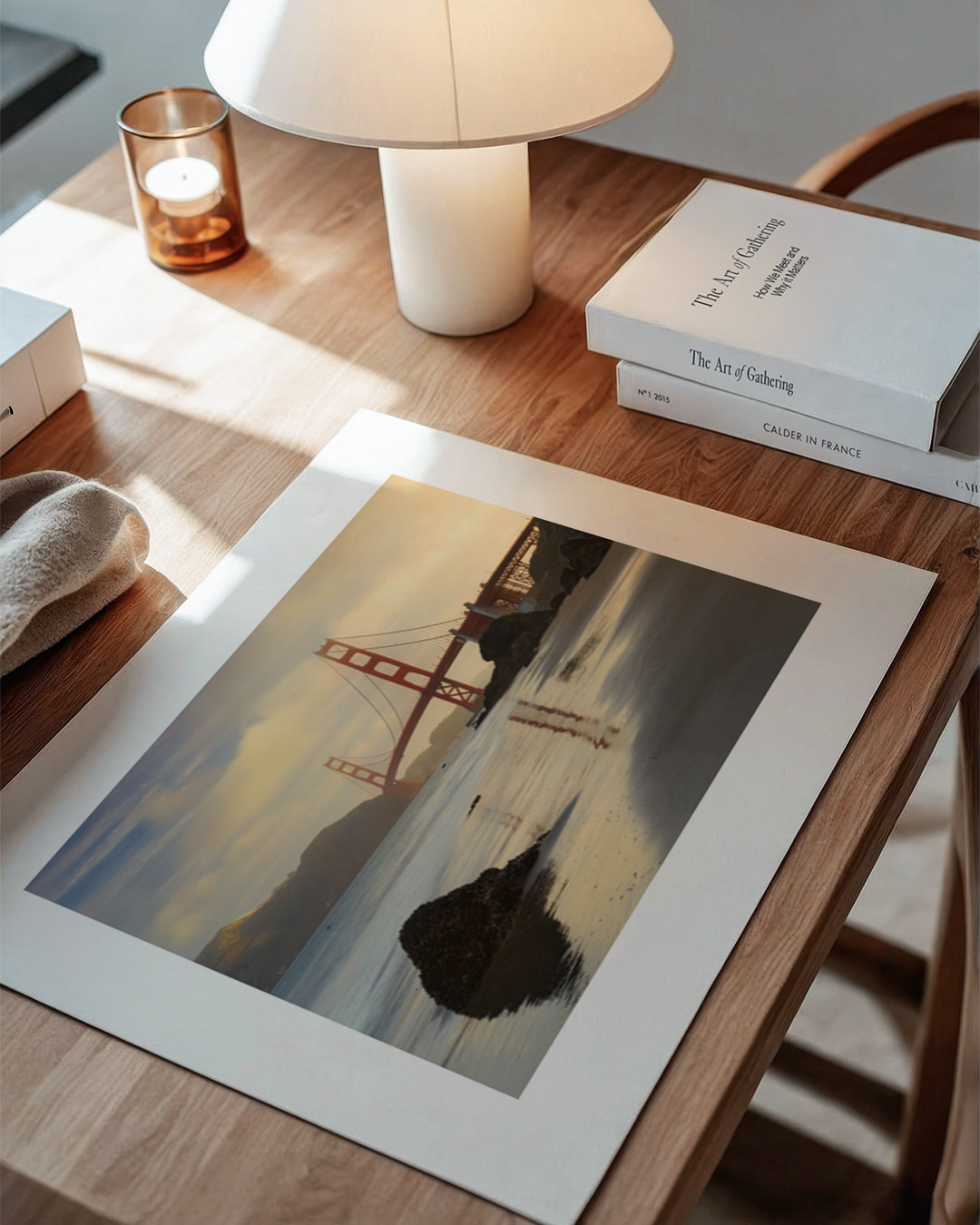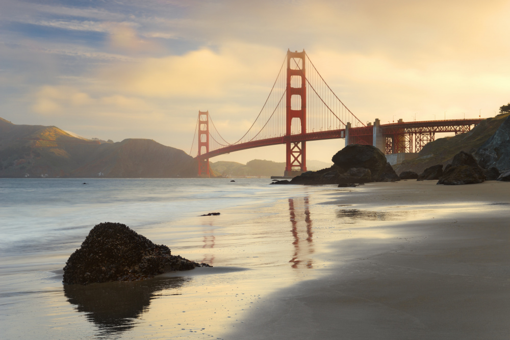 Ein atemberaubendes Foto, das die ikonische Golden Gate Bridge bei Sonnenaufgang erfasst. Das ruhige Meer spiegelt die lebendigen Farben und die Größe dieses bekannten Wahrzeichens wider, perfekt für Reisebegeisterte.