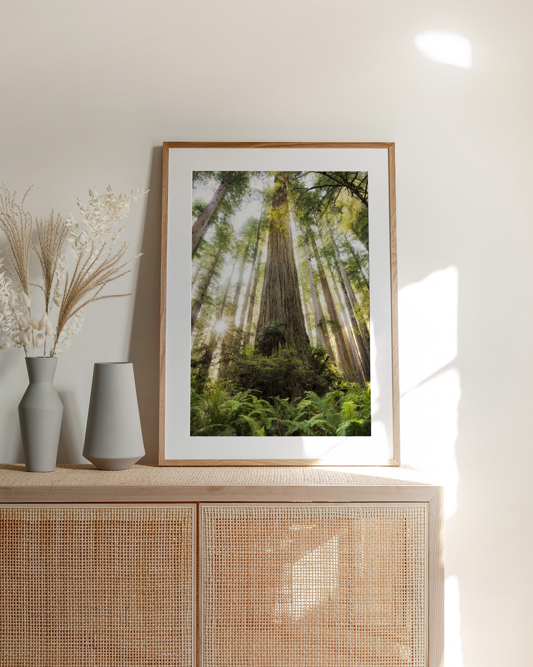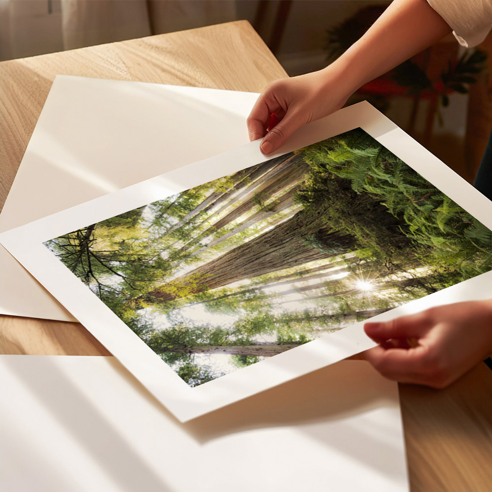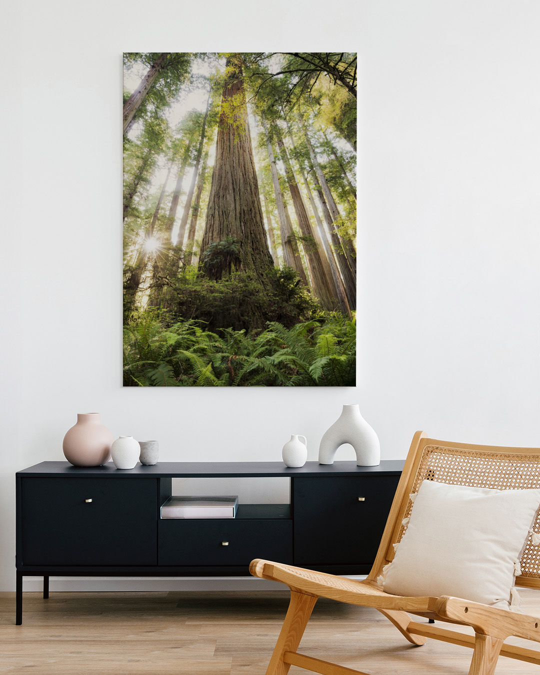 Erleben Sie die beeindruckende Schönheit hochragender Redwoods in einem sonnenbeschienenen Waldbereich. Diese Fotografie fängt die majestätische Ruhe der Naturgiganten ein.