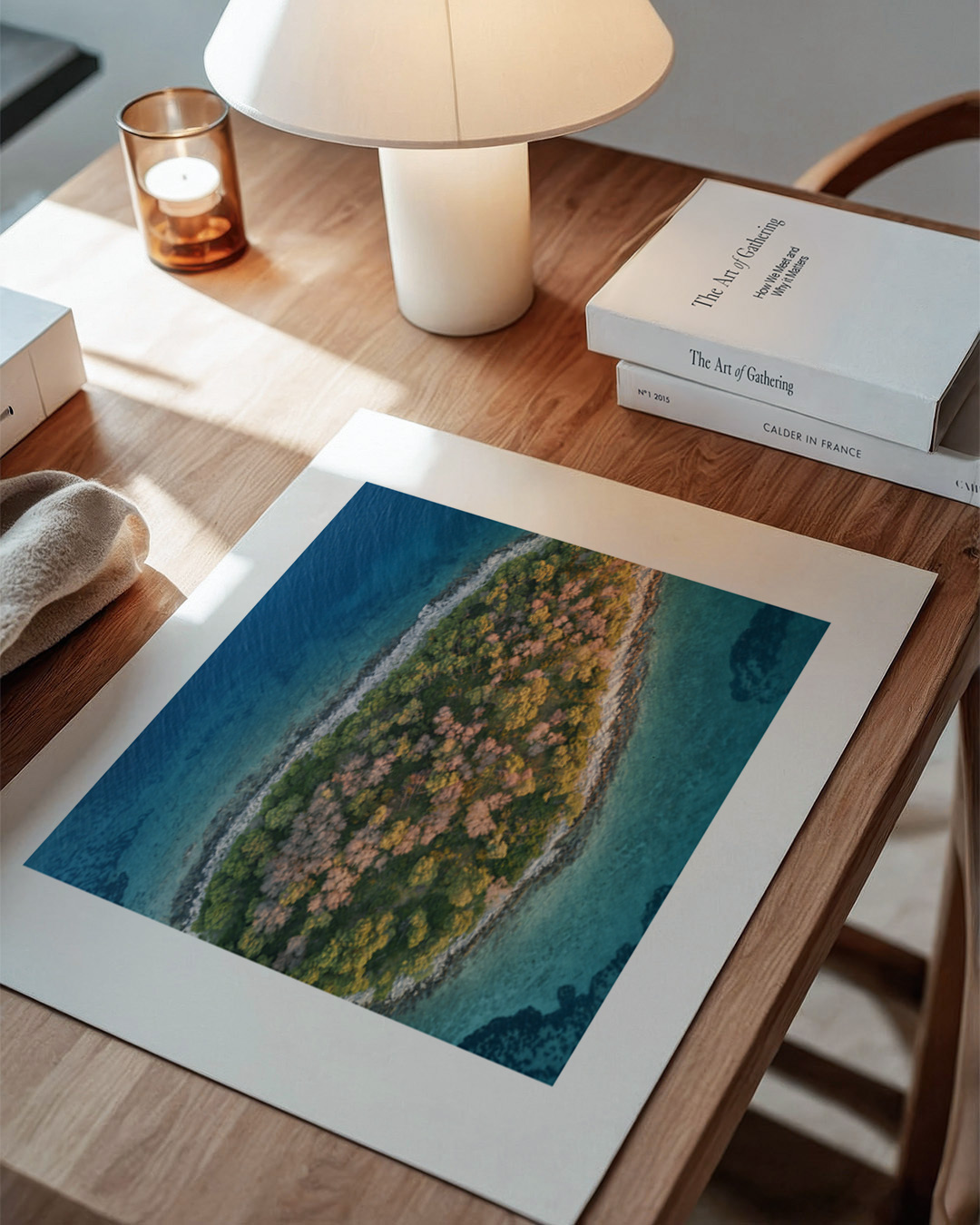 Dieses fesselnde Luftbild zeigt die friedliche Schönheit einer abgelegenen Insel, die von lebhaft türkisfarbenem Wasser umgeben ist. Ideal für Reisende und Naturfreunde, die Inspiration suchen.