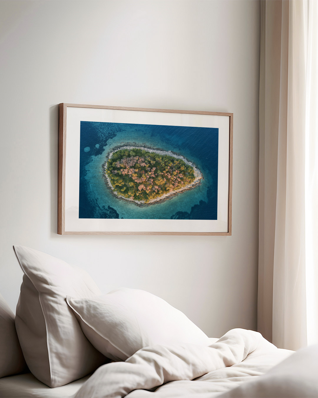Die gespannte Leinwand wird in einen stilvollen Schattenfugenrahmen aus echtem Holz eingefasst, um einen eleganten Look und zusätzliche Dimension zu schaffen. Der Raum zwischen der Leinwand und dem Rahmen erzeugt einen schwebenden Effekt.