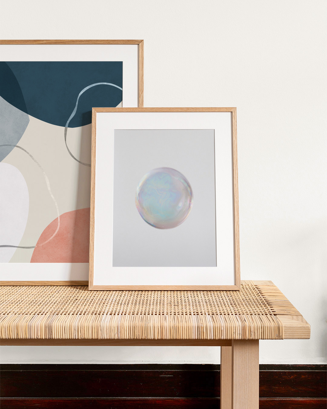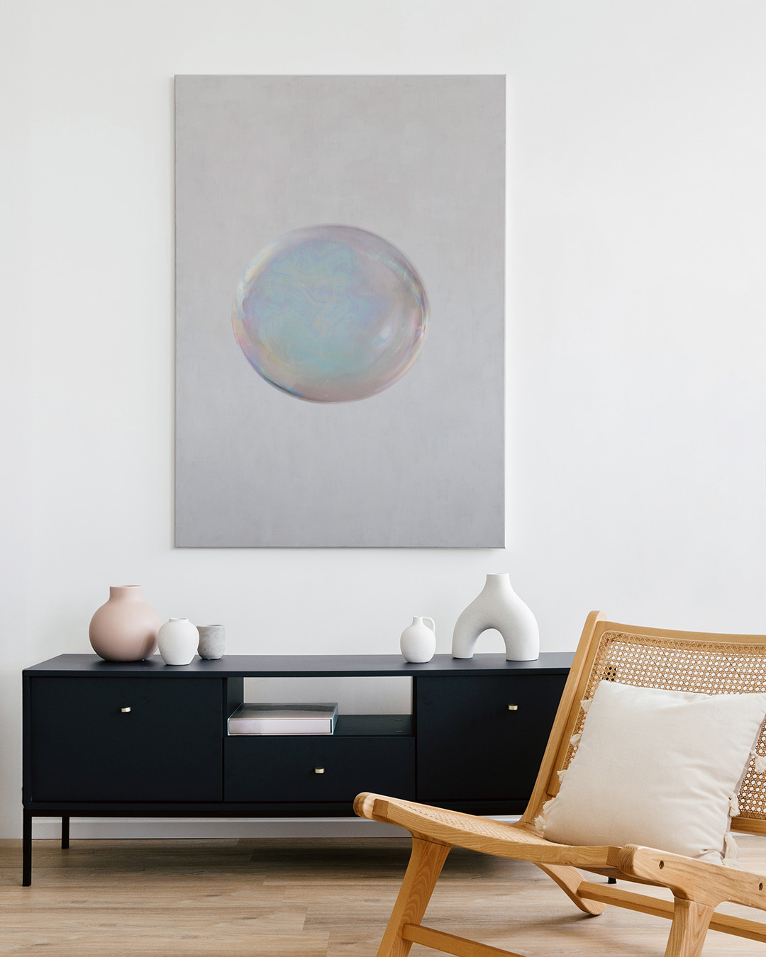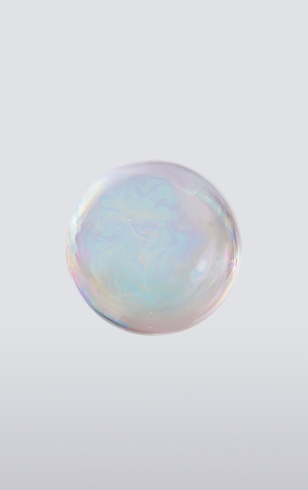 Ein minimalistisches, abstraktes Bild mit einer Nahaufnahme einer irisierenden Seifenblase, die ihre zarten Lichtreflexionen und weichen Pastellfarben zeigt.