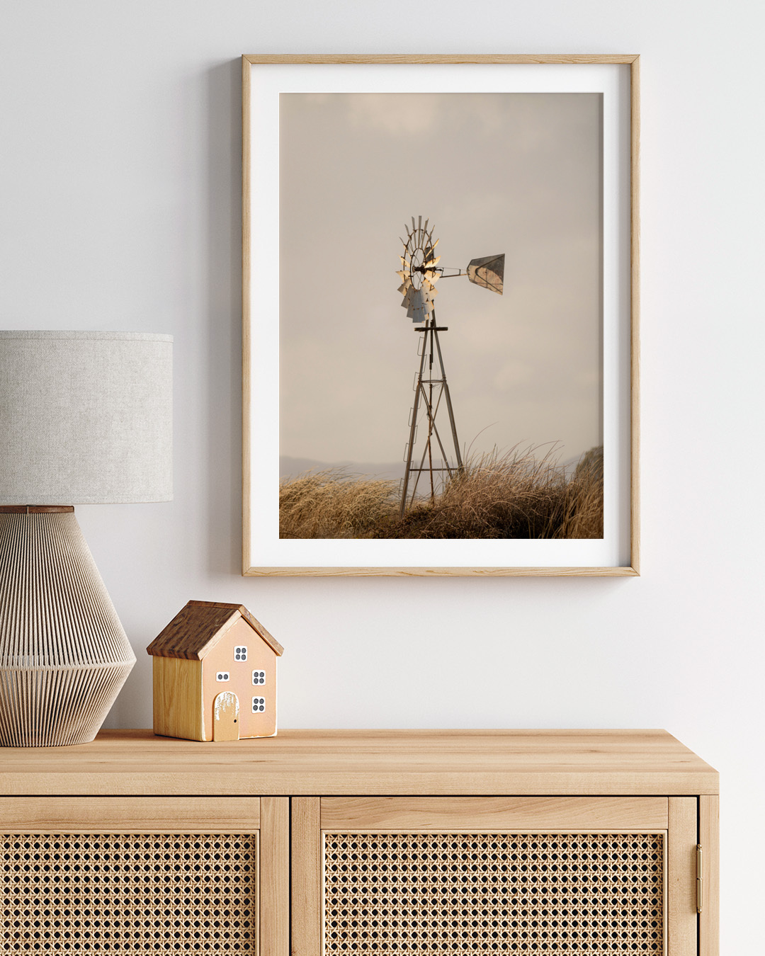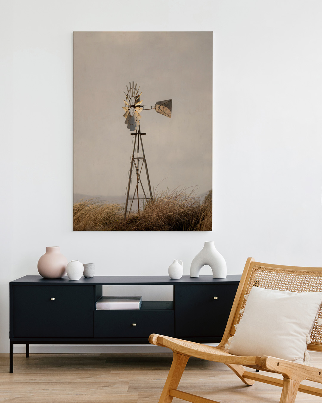 Ein ruhiges Foto von Crystal Lynn Collins, das ein rustikales Windrad in einem offenen Feld mit ruhiger Kulisse zeigt. Perfekt für diejenigen, die die Ruhe und Schönheit der Natur schätzen.