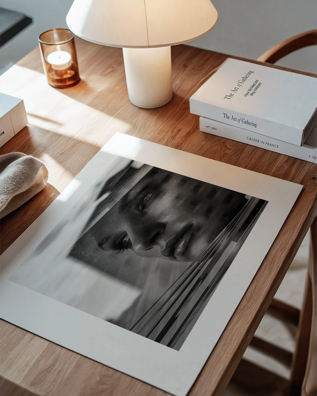 Ein beeindruckendes Schwarzweißfoto von Martin Krystynek, das einen nachdenklichen Blick durch ein Fenster einfängt, mit einer urbanen Kulisse und durchdringenden Augen.