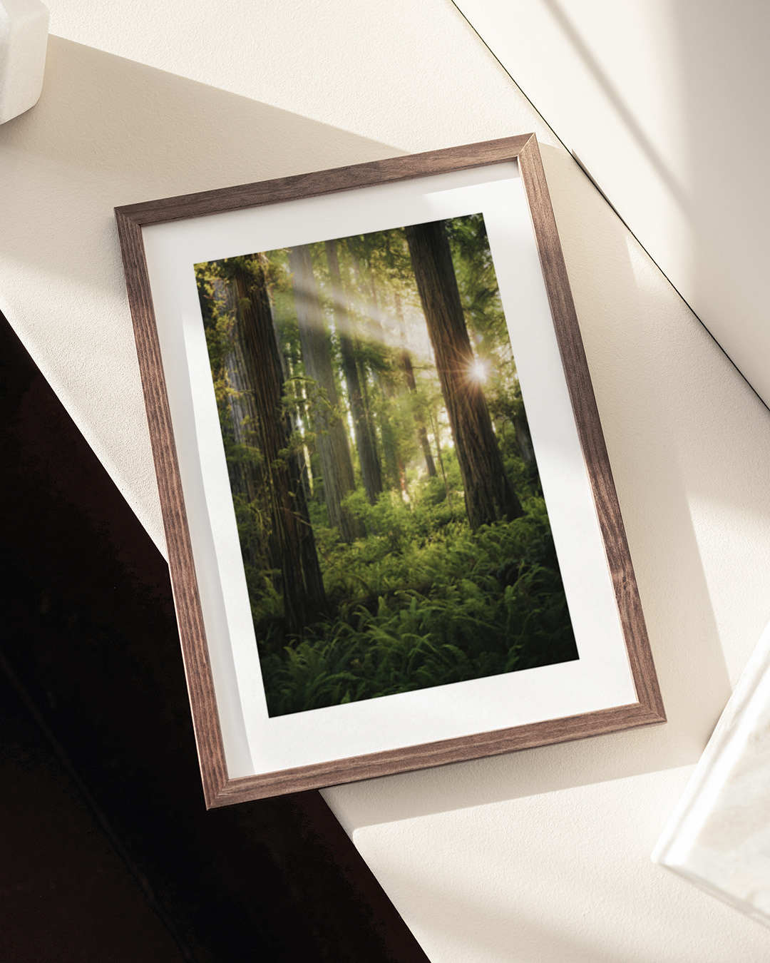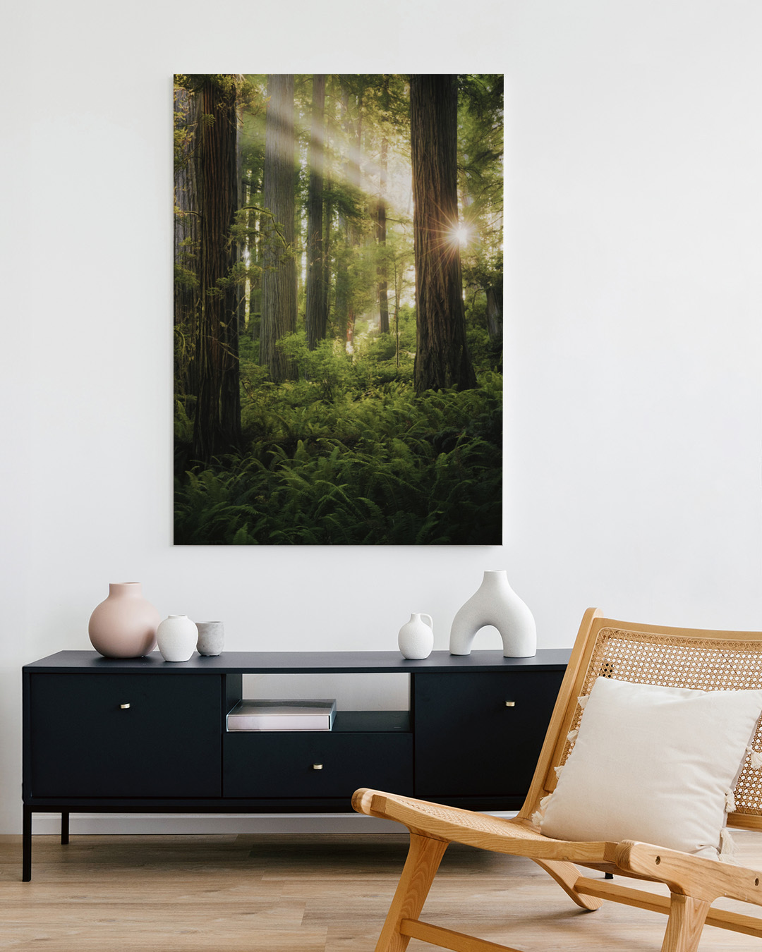 Die gespannte Leinwand wird in einen stilvollen Schattenfugenrahmen aus echtem Holz eingefasst, um einen eleganten Look und zusätzliche Dimension zu schaffen. Der Raum zwischen der Leinwand und dem Rahmen erzeugt einen schwebenden Effekt.