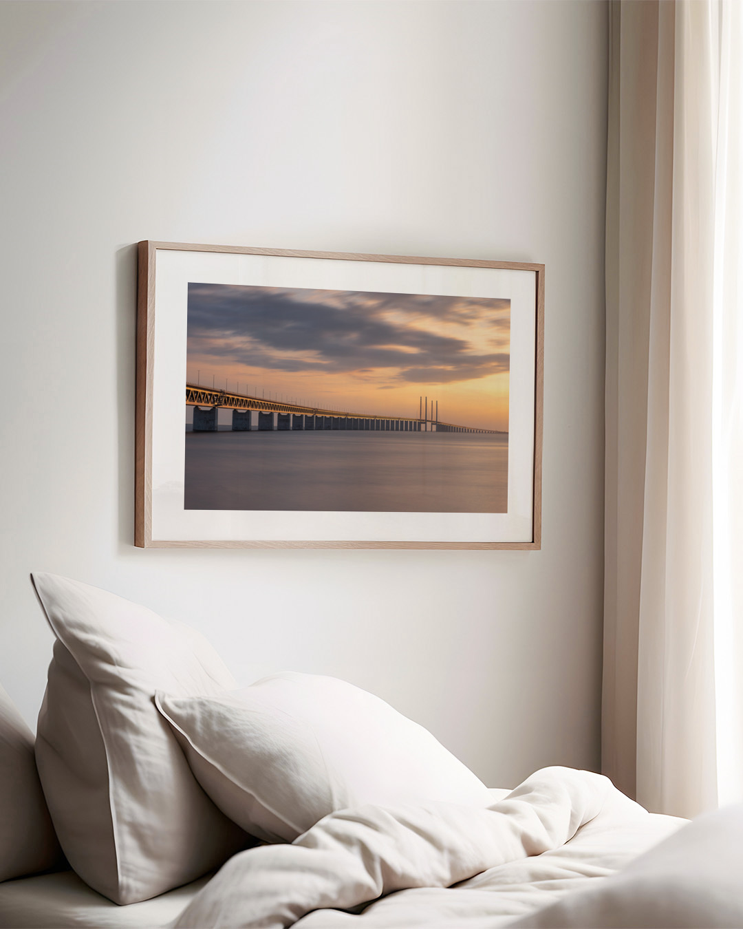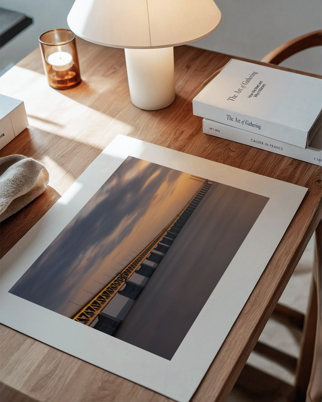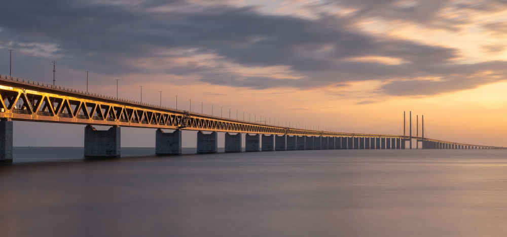 Ein atmosphärisches Foto von Alexandru Tomuță, das die ruhige Ausdehnung einer langen Brücke über stille Wasser bei Sonnenuntergang zeigt und Themen wie Verbindung und Reisen anspricht.