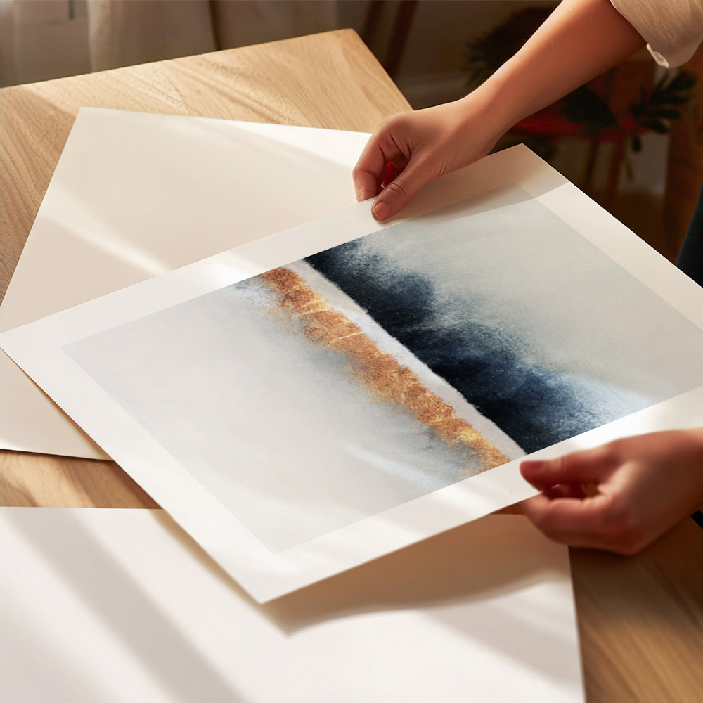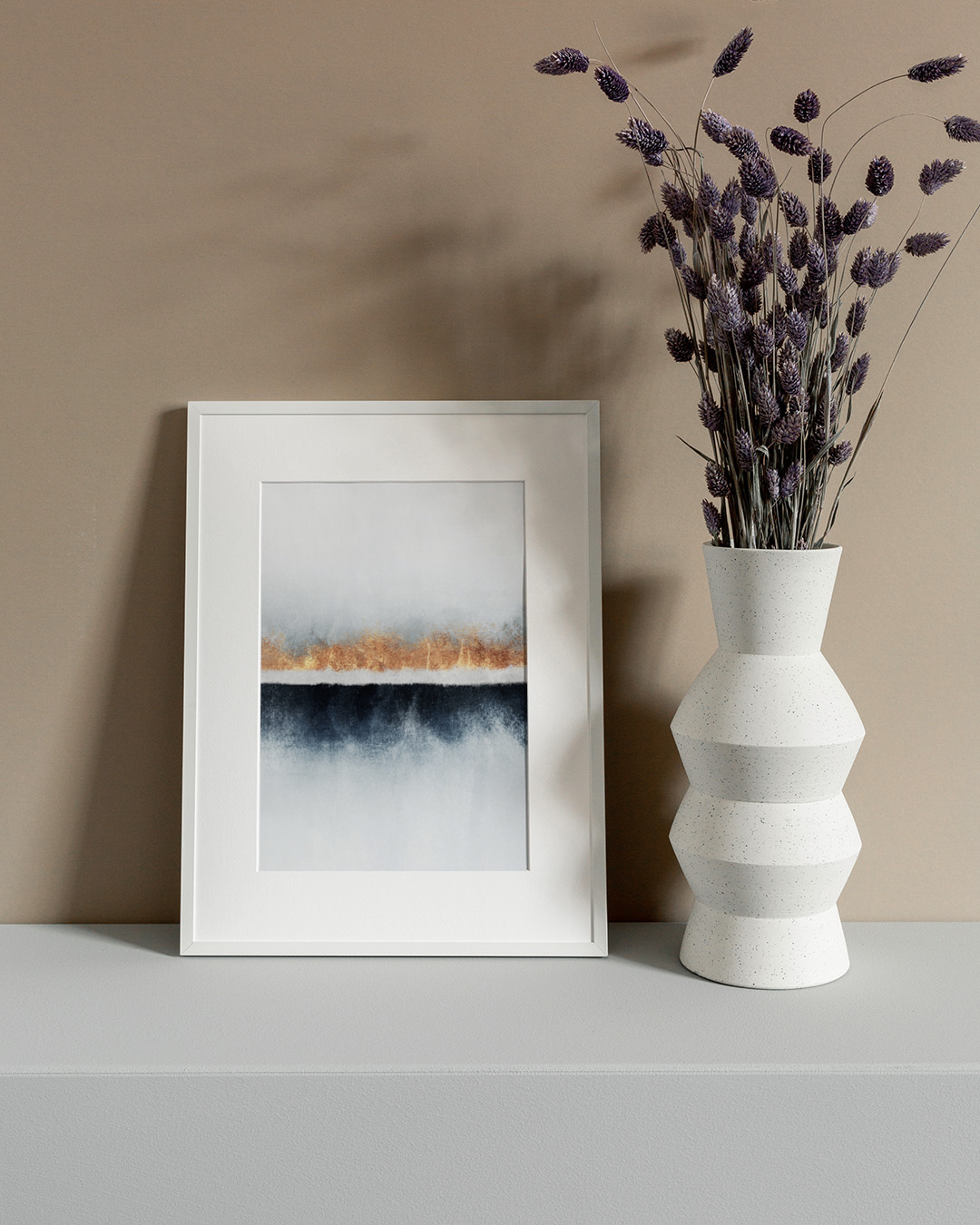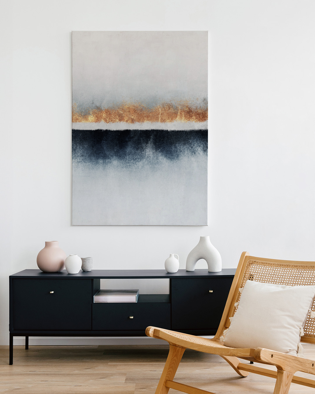 Die gespannte Leinwand wird in einen stilvollen Schattenfugenrahmen aus echtem Holz eingefasst, um einen eleganten Look und zusätzliche Dimension zu schaffen. Der Raum zwischen der Leinwand und dem Rahmen erzeugt einen schwebenden Effekt.
