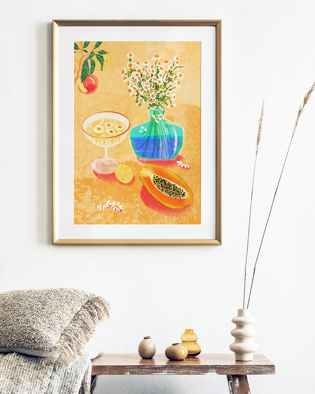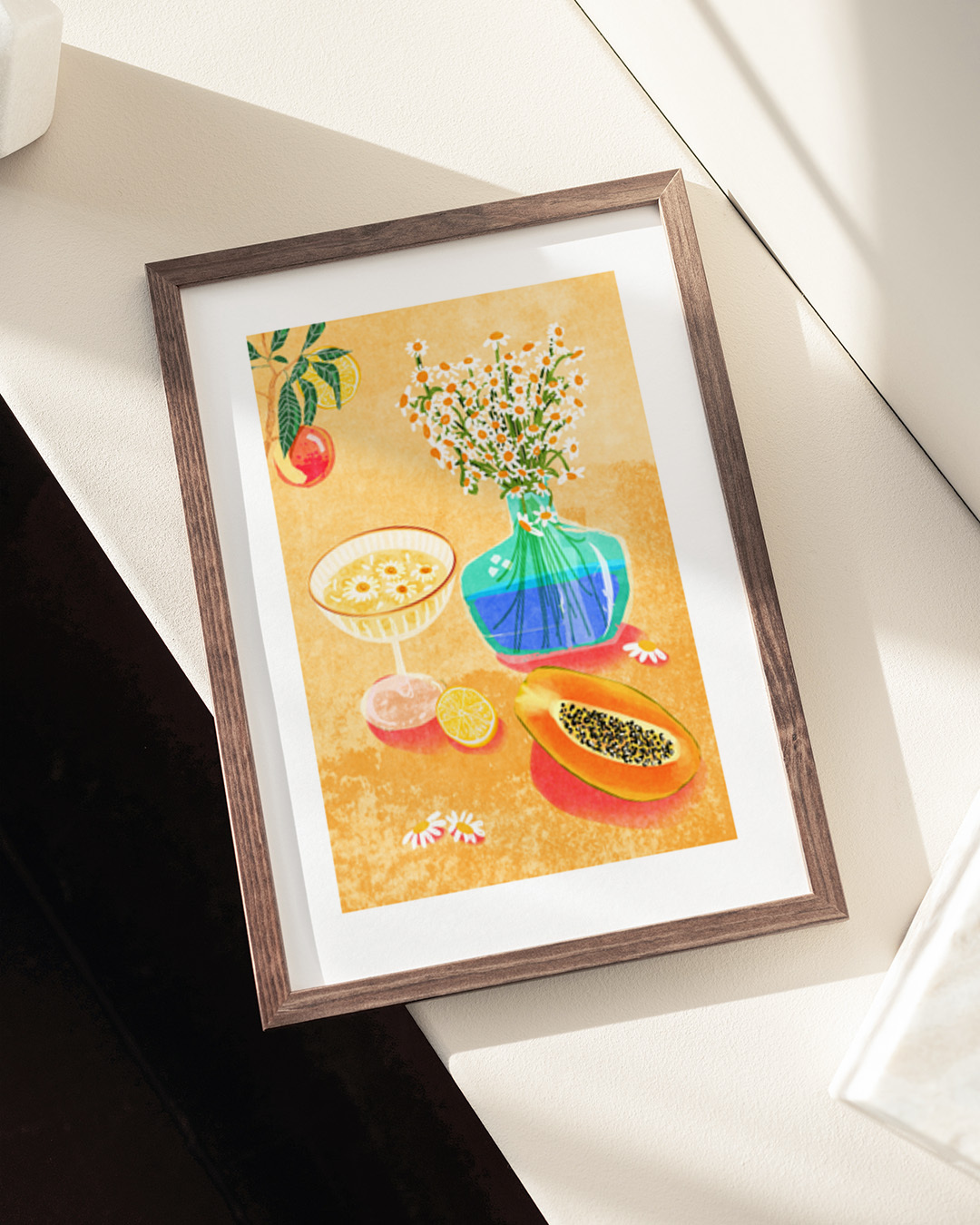 Eine farbenfrohe Illustration von Raissa Oltmanns, die eine Sommer Szene mit lebhaften Blumen in einer Vase, einer Papaya und einem Cocktail mit Blumenverzierungen zeigt.