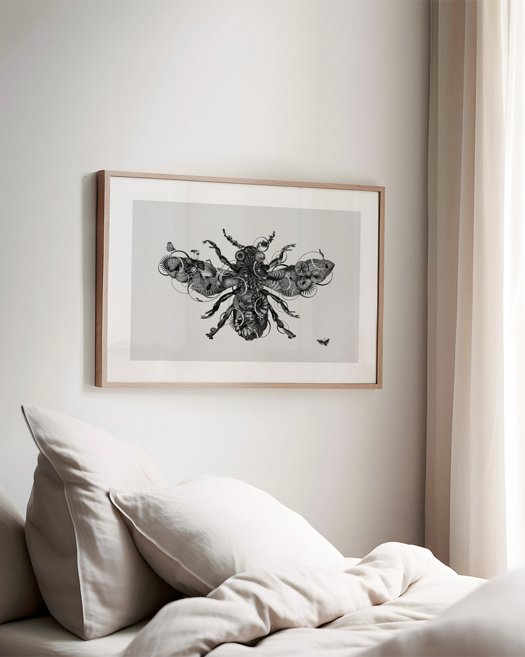 Erkunden Sie die komplexen Details in Jaco Putkers schwarz-weißer Darstellung einer Biene. Diese Illustration hebt komplexe Muster und Texturen hervor, die das Insekt zum Leben erwecken.