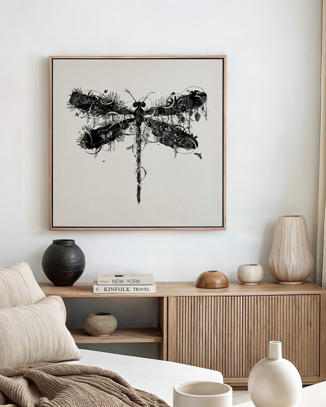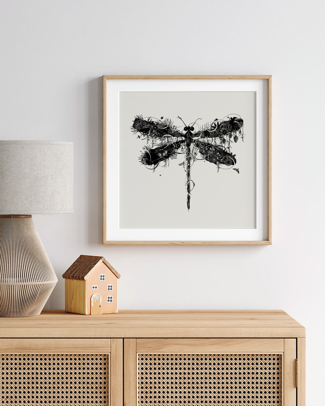 Entdecken Sie eine sorgfältig detaillierte botanische Illustration mit einer Libelle von Jaco Putker. Dieses Kunstwerk verbindet komplexe Blüten- und Faunenelemente zu einem faszinierenden Design.