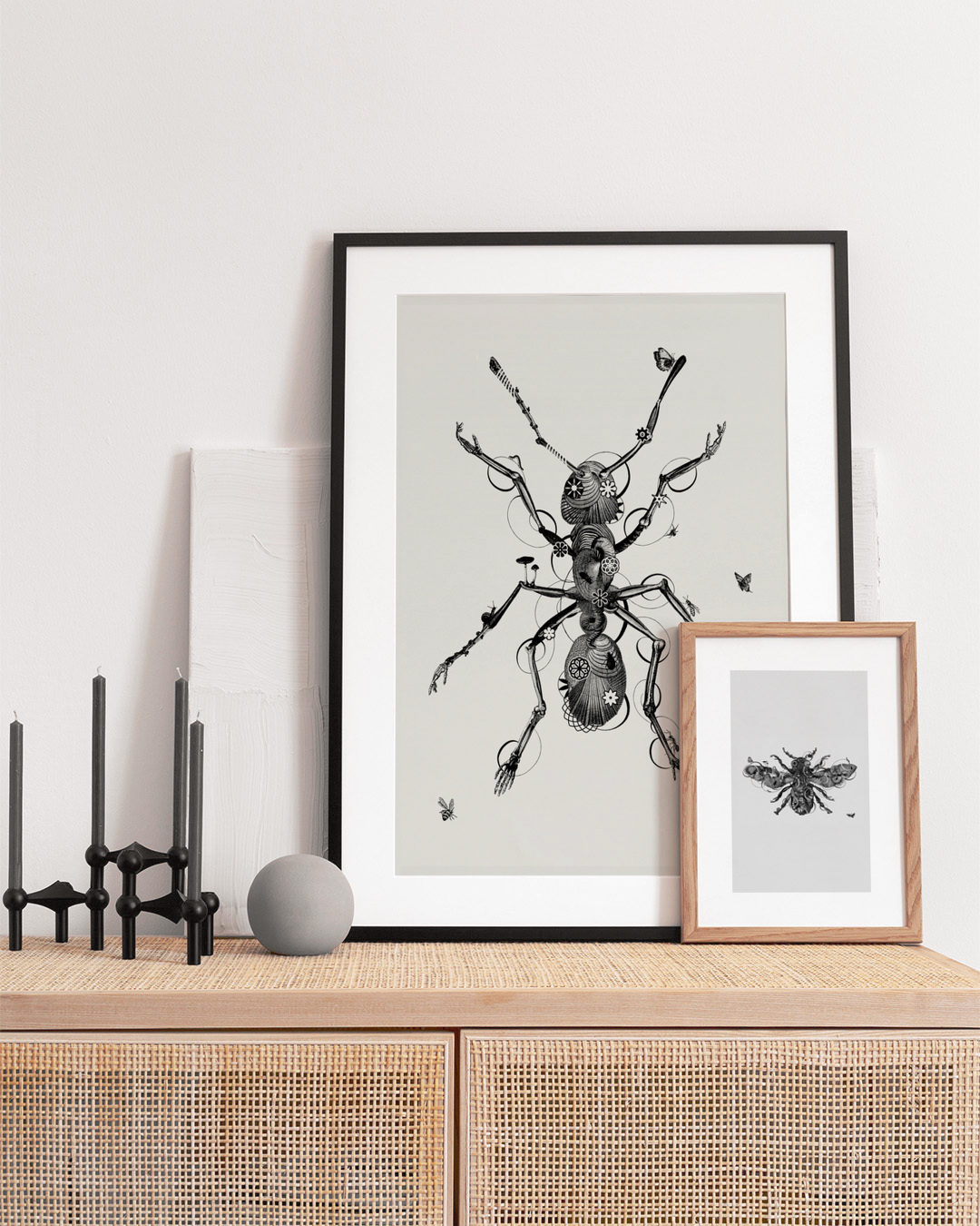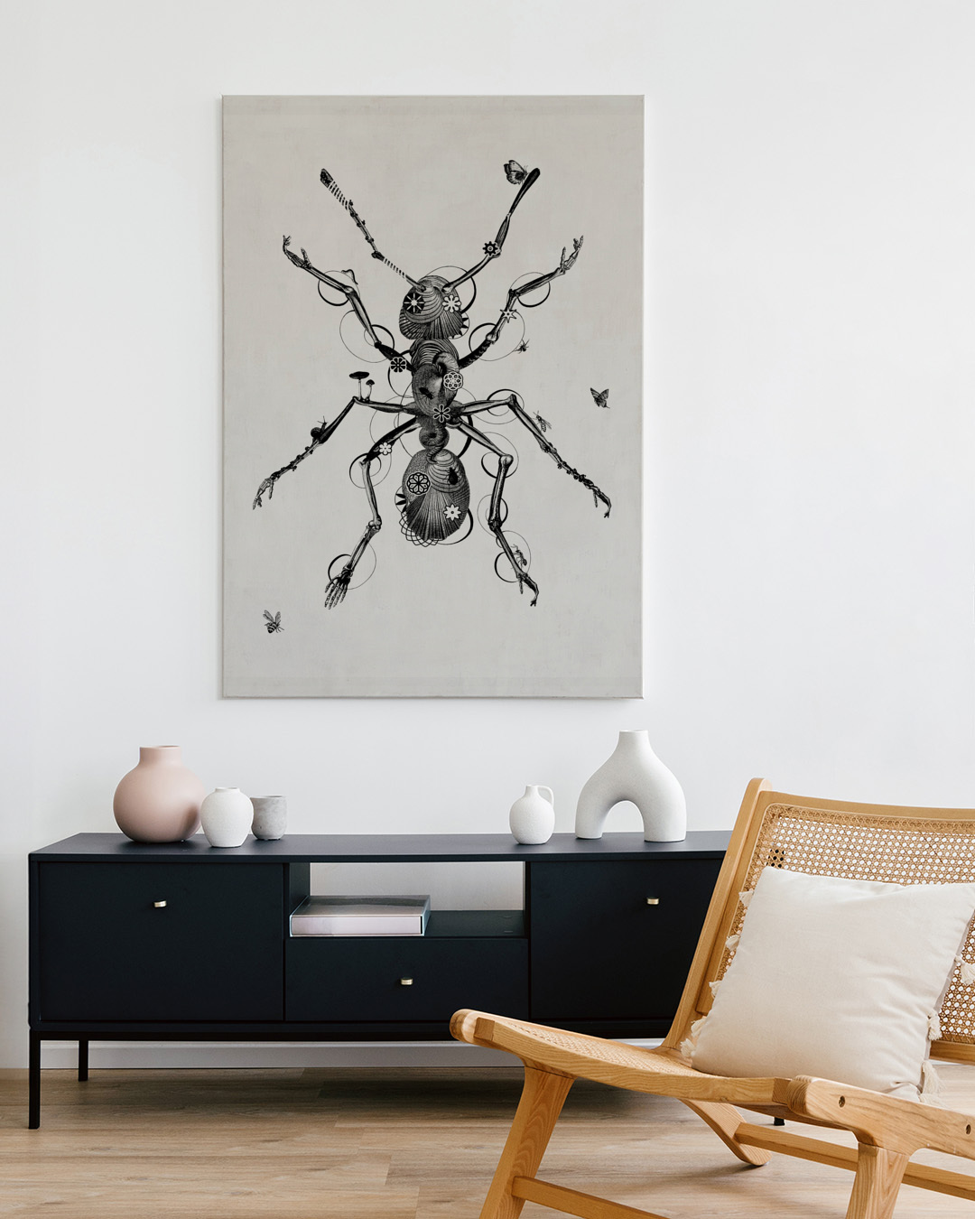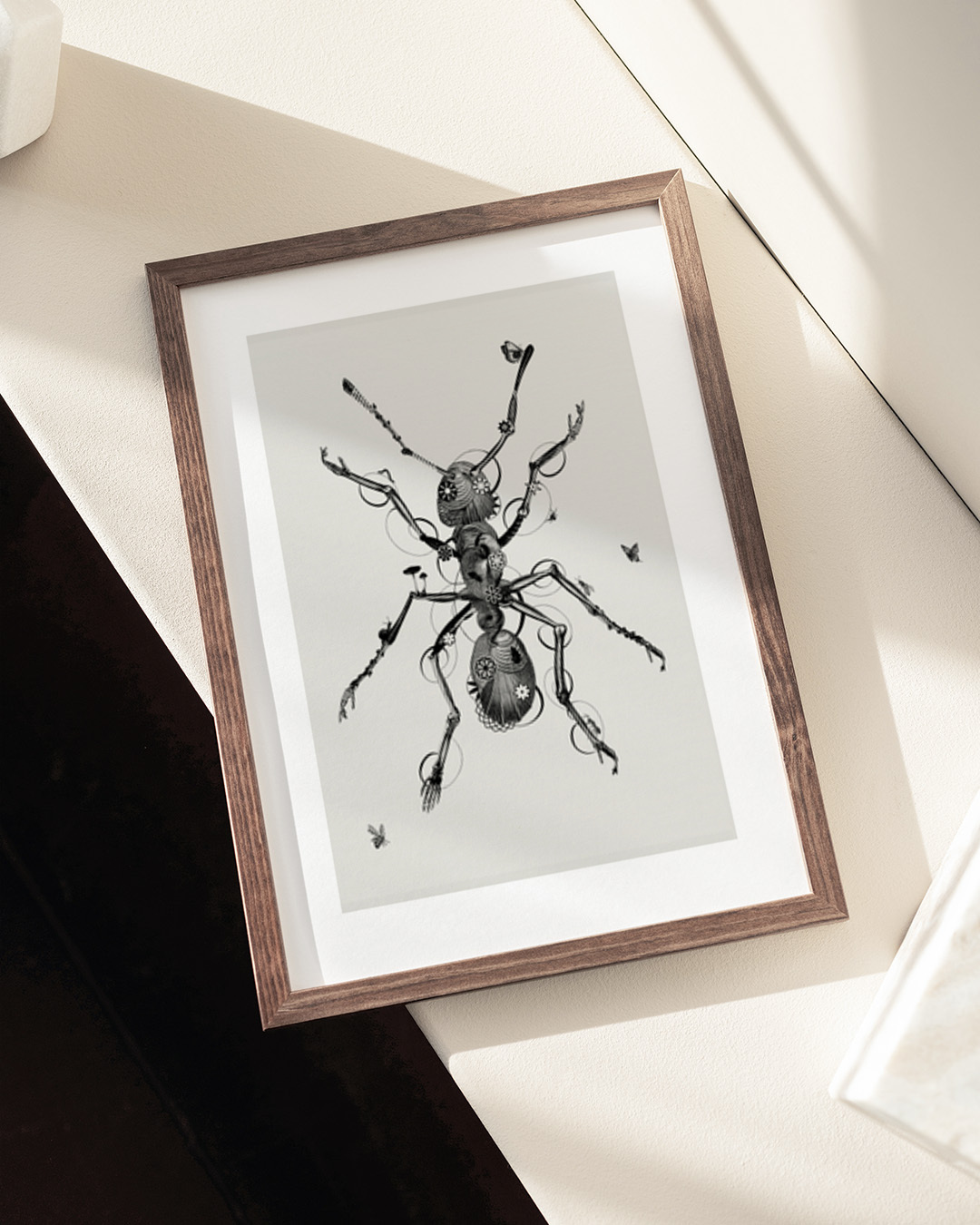 Schätzen Sie Jaco Putkers einzigartigen Kunststil mit dieser detaillierten Illustration einer schwarzen Ameise. Das feine Design integriert wunderschön verschiedene Elemente und schafft eine faszinierende Darstellung eines Insekts.