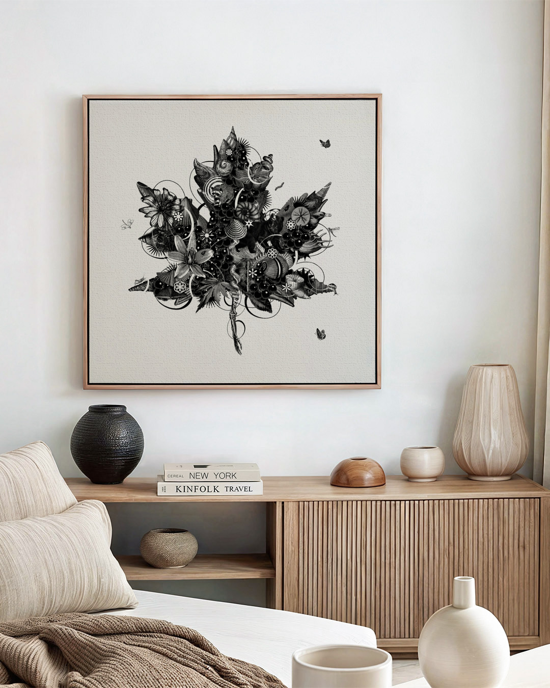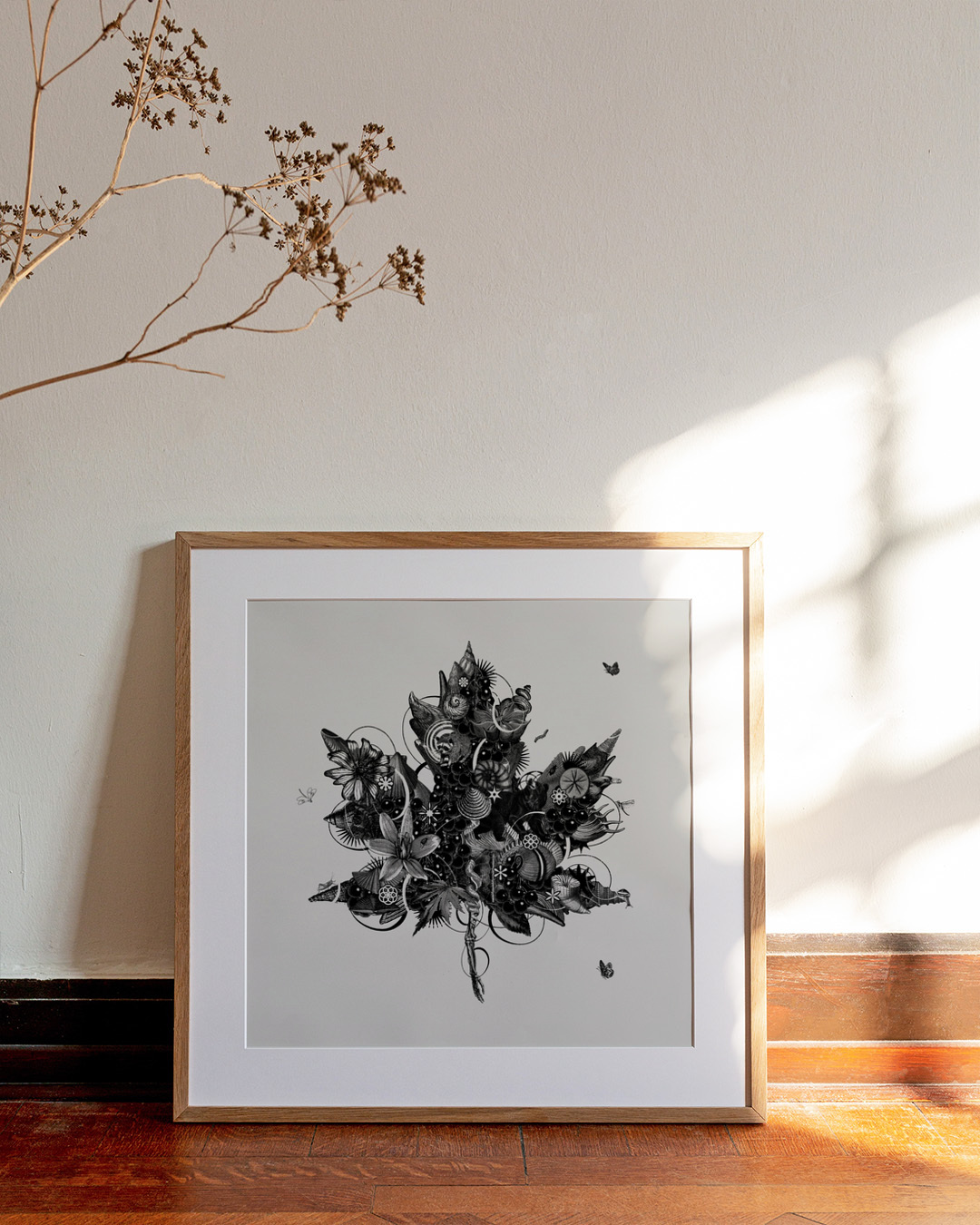 Entdecken Sie Jaco Putkers komplexe Collage eines Ahornblattes, die detaillierte Naturelemente und abstrakte Texturen in auffälligem Schwarz-Weiß zeigt.