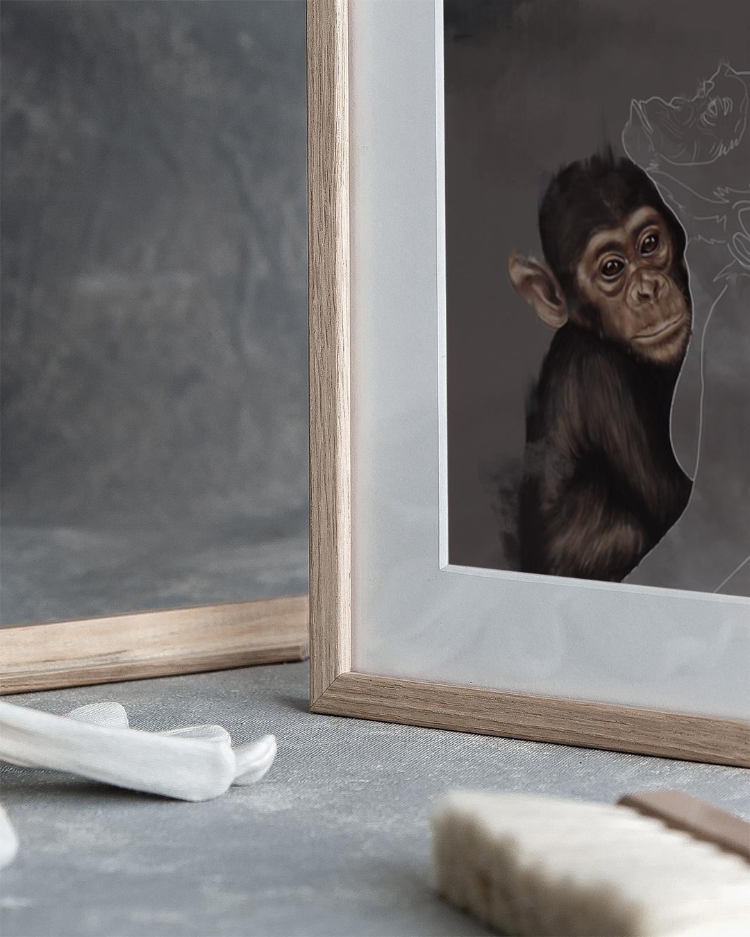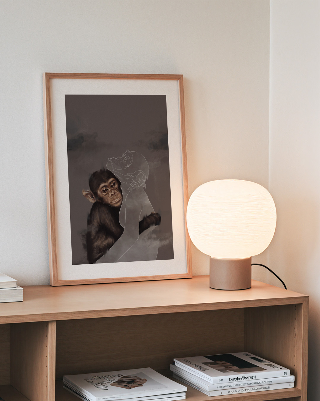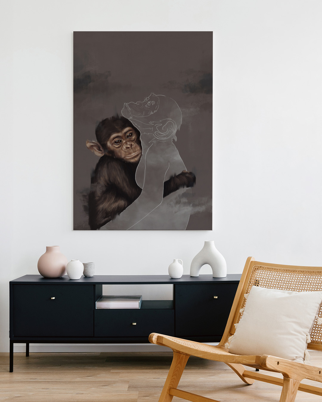 Ein nachdenkliches Werk von Gabriella Roberg, das einen Schimpansen zeigt, der liebevoll eine Silhouette umarmt, symbolisiert eine unzerbrechliche Bindung trotz Abwesenheit.
