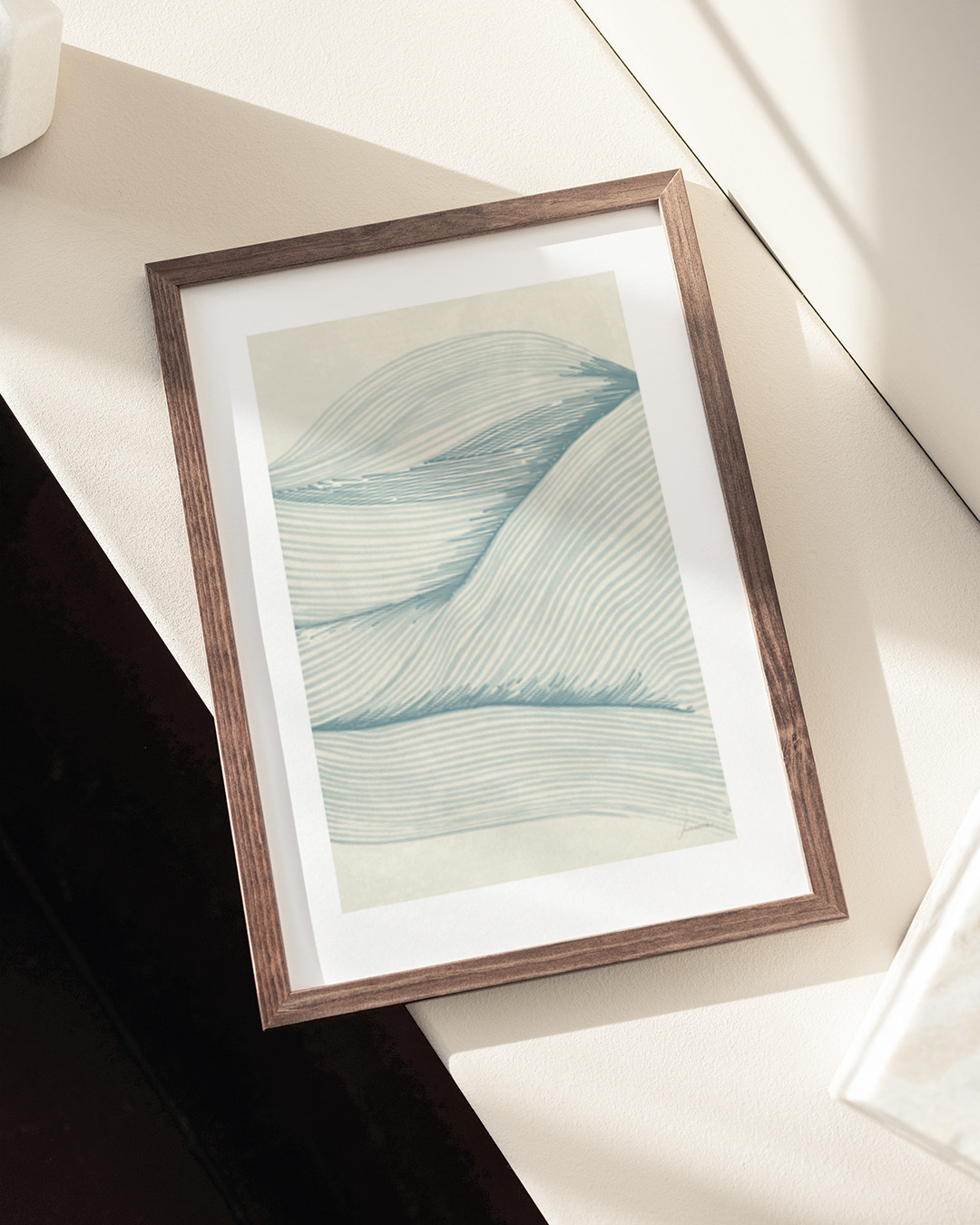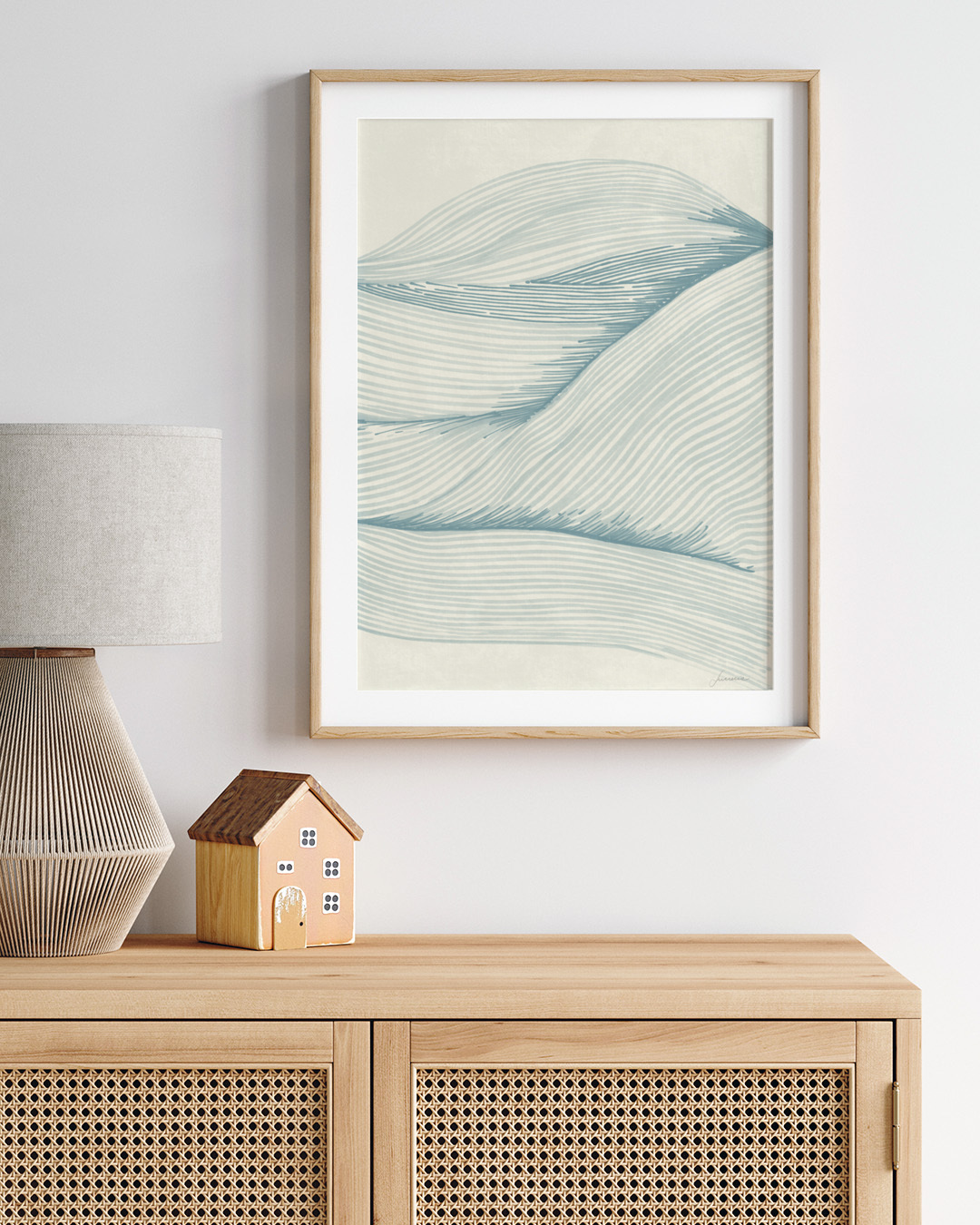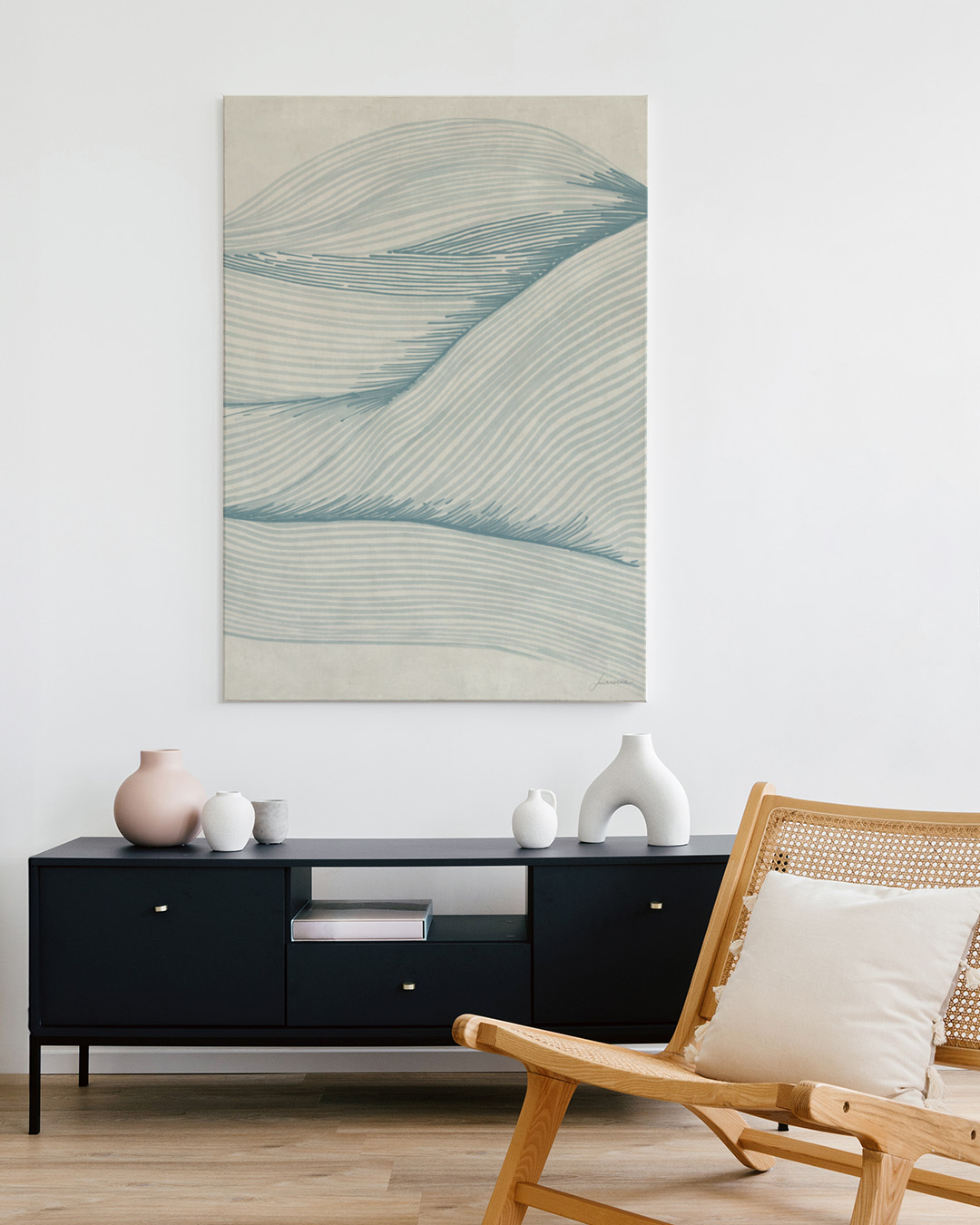 Lucrecia Caporale fängt die beruhigende Essenz des Ozeans mit eleganten Linien und beruhigenden Farbtönen ein. Das minimalistische Design weckt ein Gefühl von Ruhe mit fließenden Formen, die Wellen nachahmen.