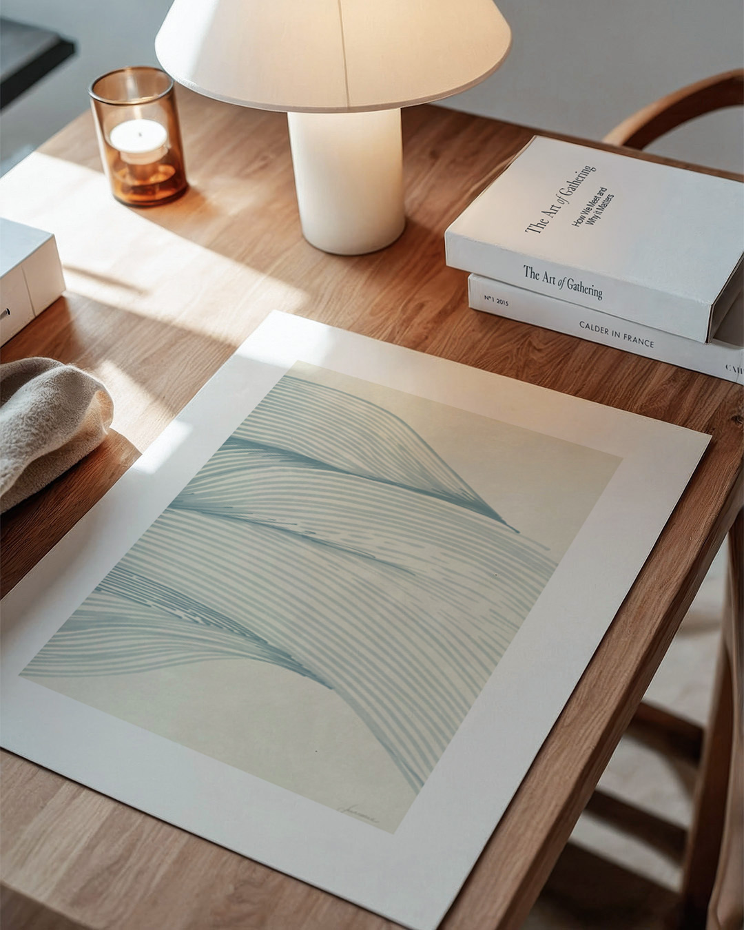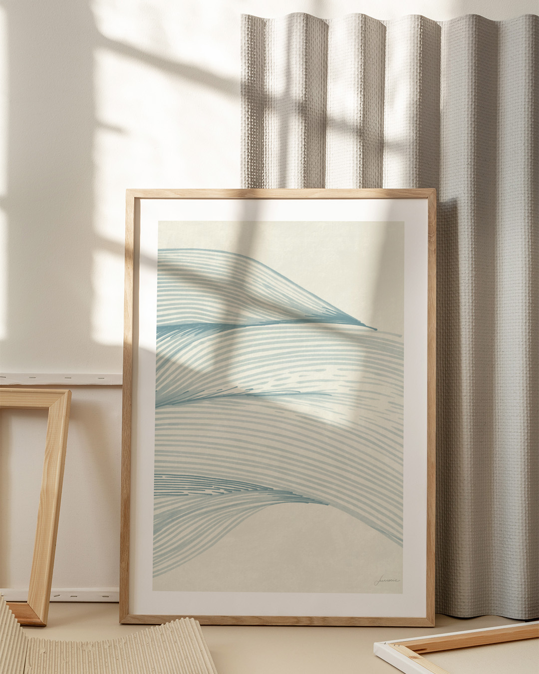 Ein eleganter Kunstdruck von Lucrecia Caporale, der fließende türkise Linien zeigt, die an Meereswellen erinnern. Dieses minimalistische Design bringt Ruhe und Bewegung in jeden Raum.