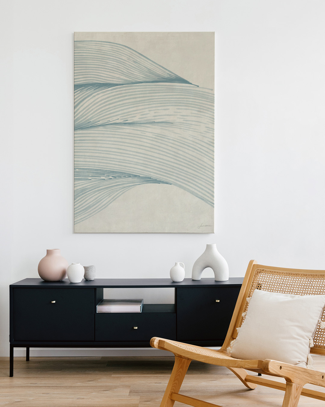 Die gespannte Leinwand wird in einen stilvollen Schattenfugenrahmen aus echtem Holz eingefasst, um einen eleganten Look und zusätzliche Dimension zu schaffen. Der Raum zwischen der Leinwand und dem Rahmen erzeugt einen schwebenden Effekt.