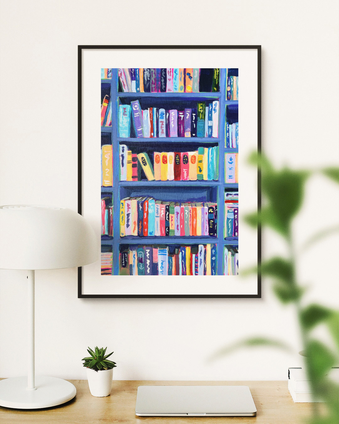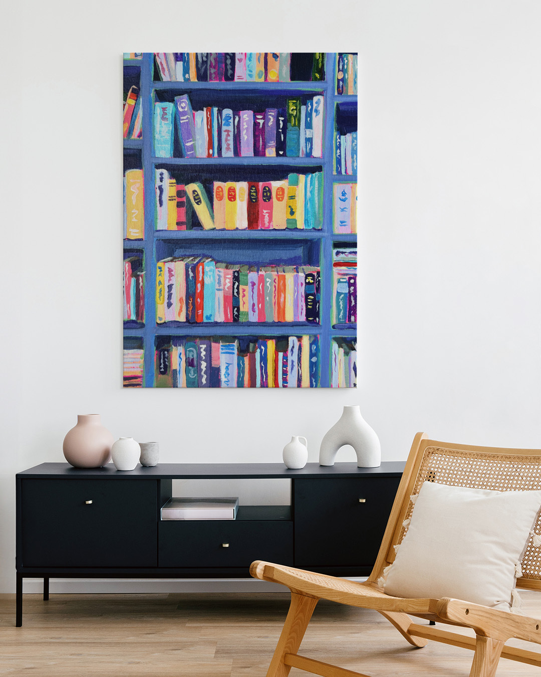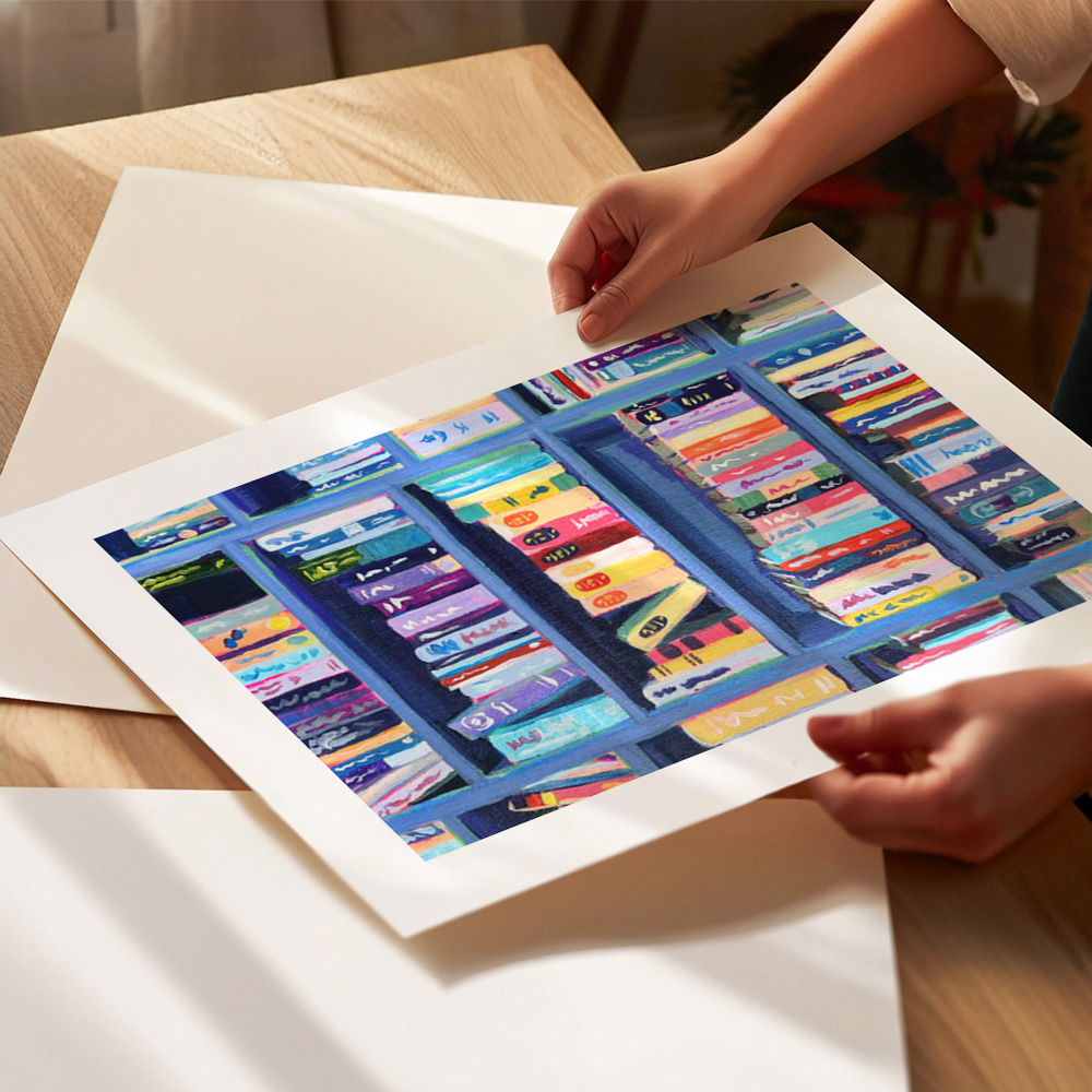 Ein lebendiges Gemälde mit einem Bücherregal voller bunter Bücher in einer bibliothek. Diese fesselnde Komposition betont sowohl architektonischen Charme als auch literarische Anziehungskraft und schafft eine warme intellektuelle Atmosphäre.