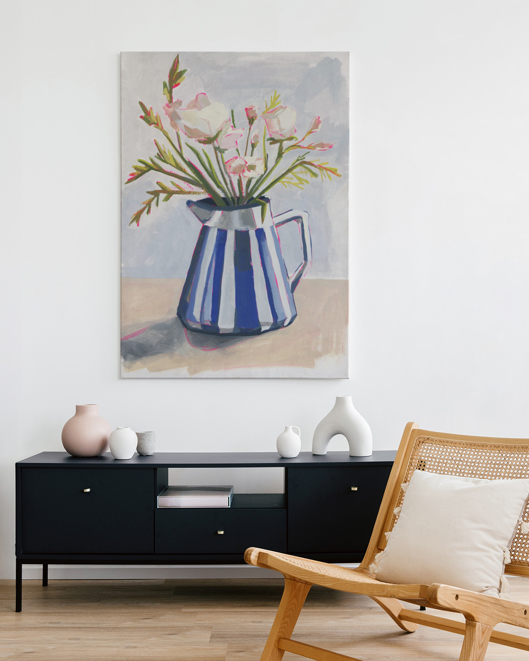 Ein fesselndes Gemälde von Lucrecia Caporale, das frische Blumen wunderschön arrangiert in einem blau-weiß gestreiften Krug zeigt. Die Komposition verleiht Charme mit ihren komplizierten Blütendetails.