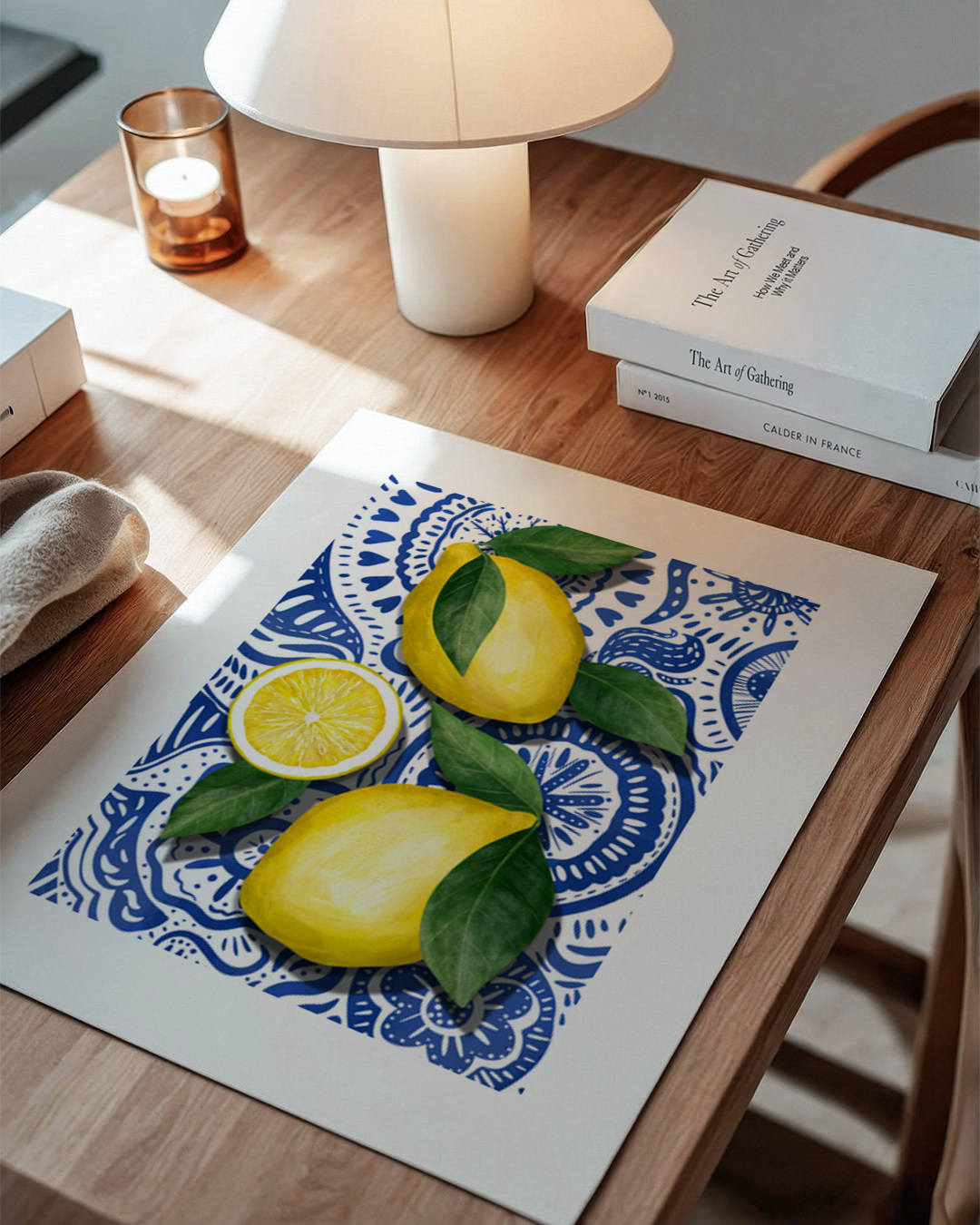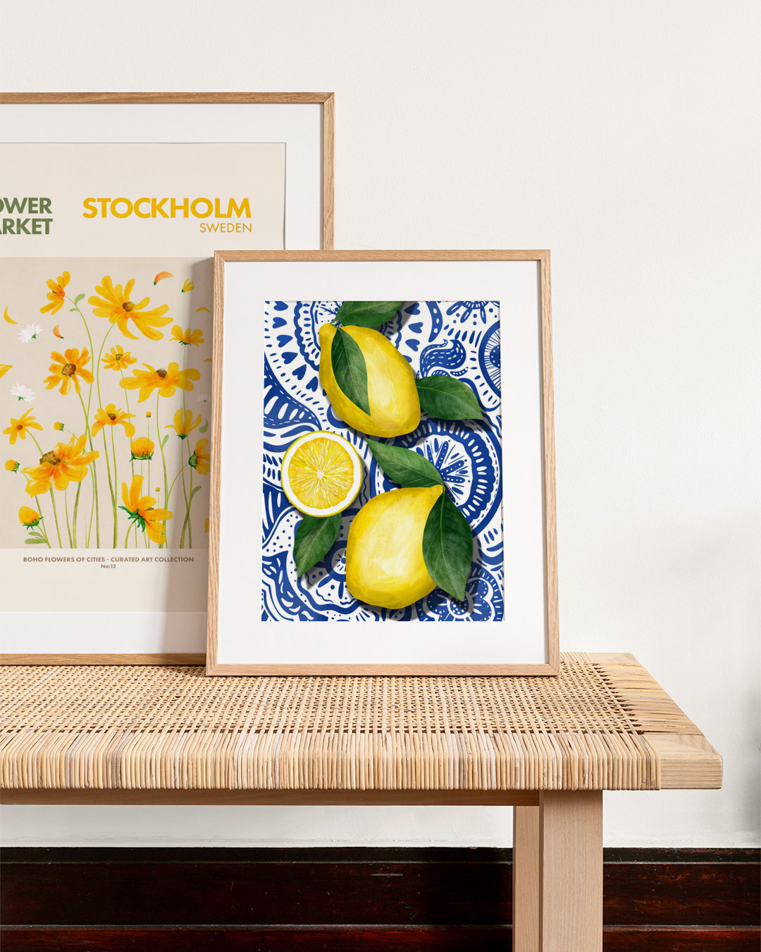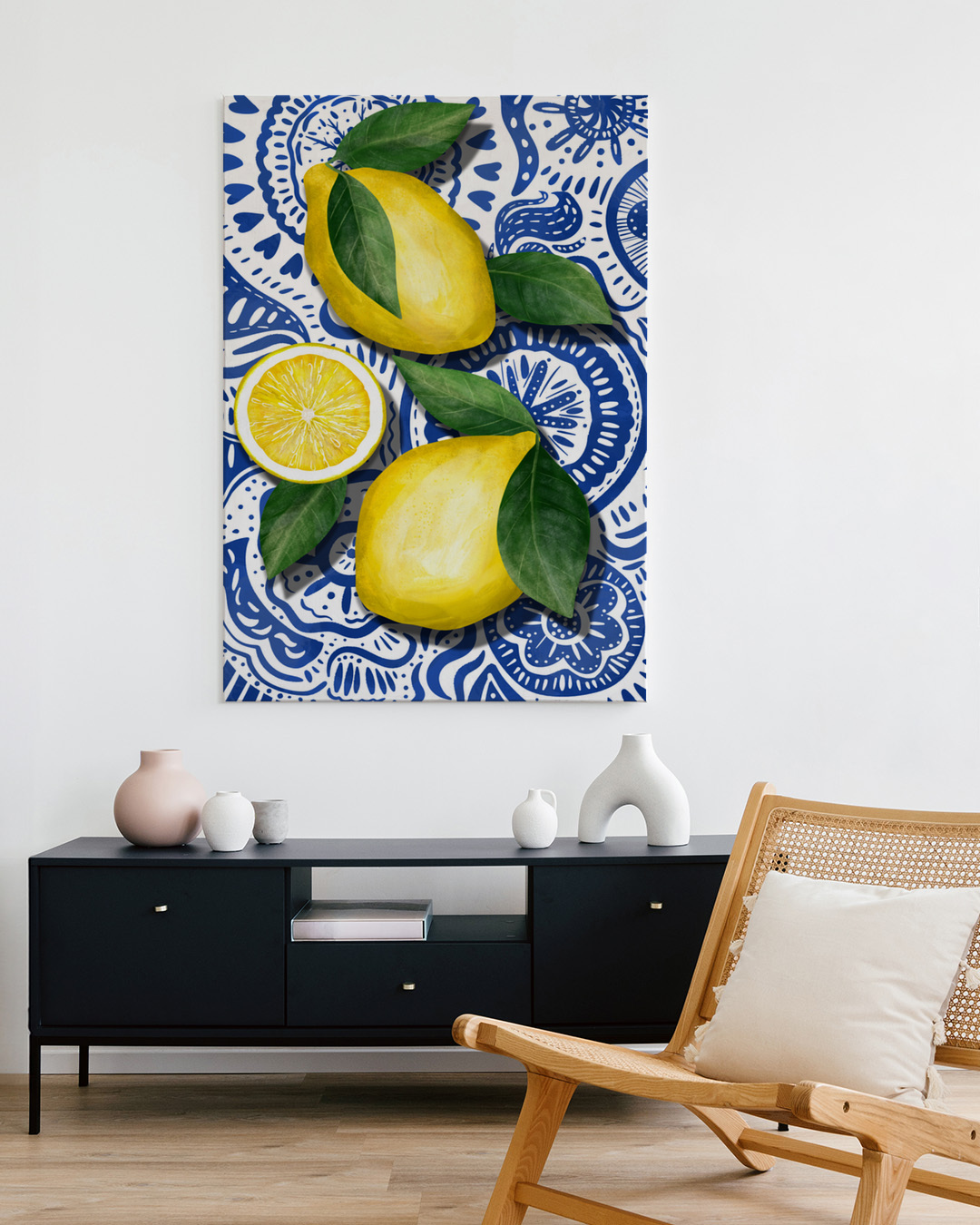 Lebendige Grafik von frischen, reifen Zitronen vor einem fesselnden blauen Muster Hintergrund. Dieses botanische Werk von Emelie Bylund bringt lebendige Zitruscharme in jeden Raum und verbindet Natur mit künstlerischem Flair.