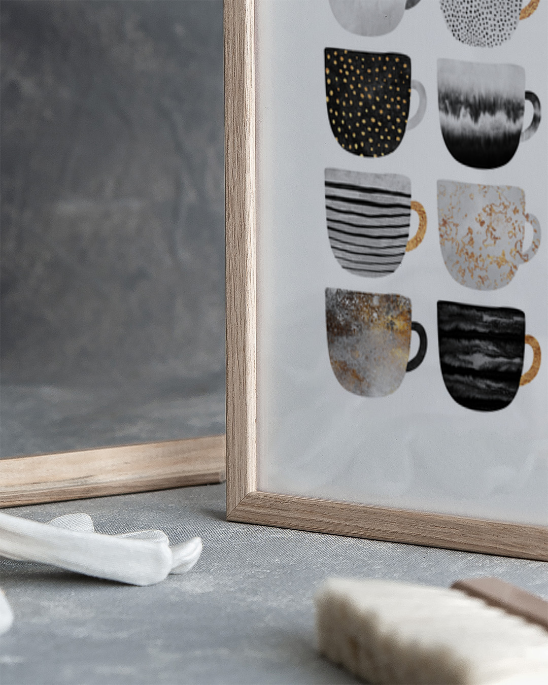 Ein stilvolles grafisches Design mit einer Sammlung eleganter Kaffeetassen mit verschiedenen komplizierten Mustern. Eine ideale Ergänzung für moderne Kücheneinrichtungen.