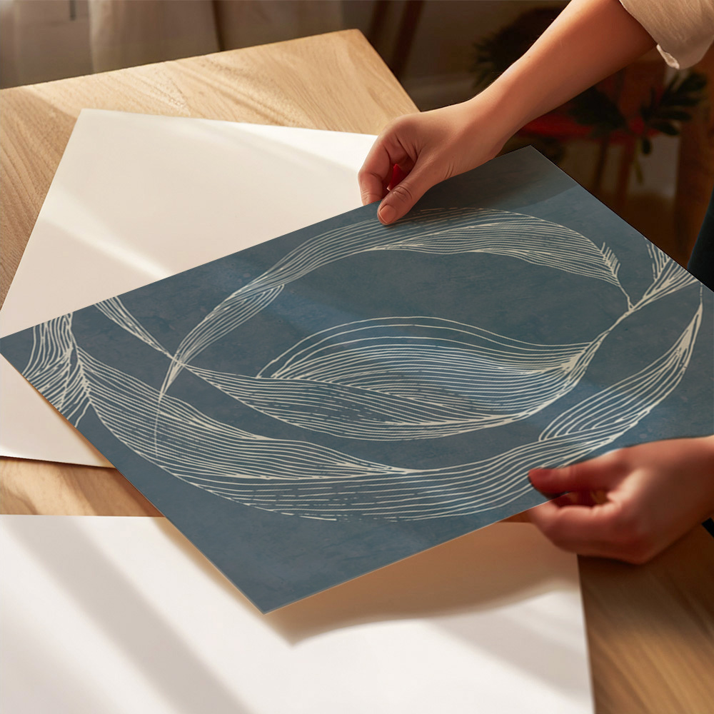 Lucrecia Caporales Werk zeigt geschwungene weiße Linien auf einem tiefblauen Hintergrund und ruft Bewegung und Eleganz hervor. Das abstrakte Design strahlt eine fließende Dynamik aus, perfekt für ein modernes Interieur.
