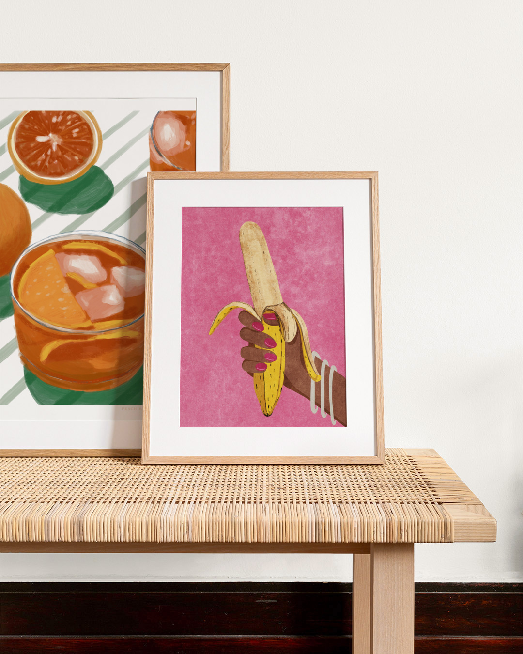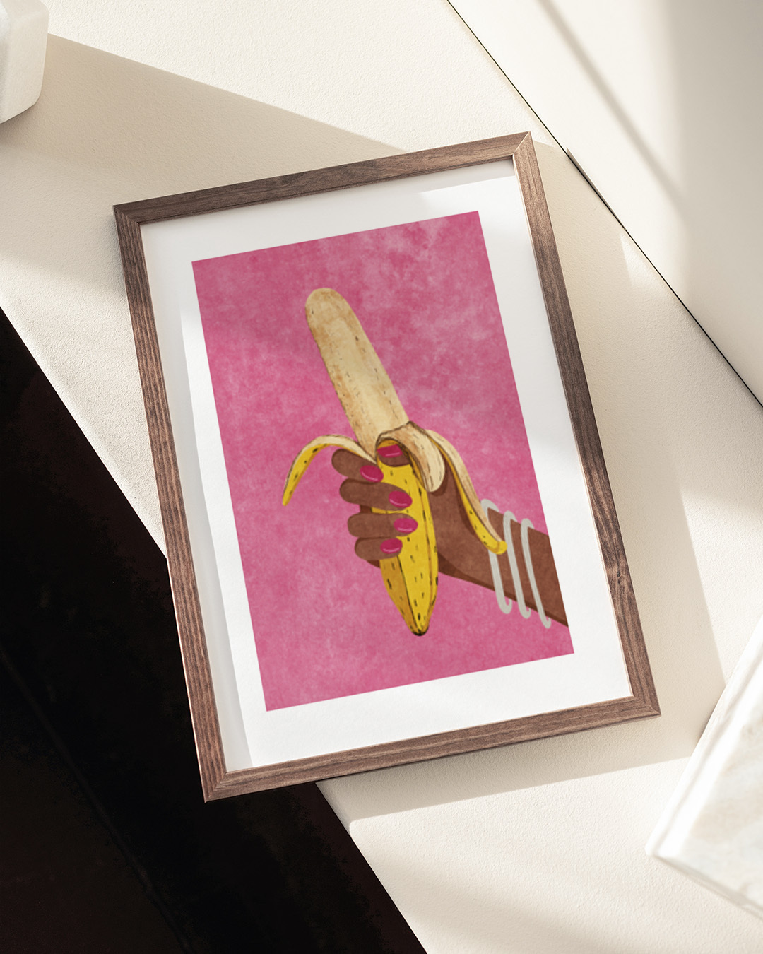 Eine lebendige Illustration von Raissa Oltmanns, die eine Hand zeigt, die eine geschälte Banane vor einem hellrosa Hintergrund hält. Die braune Hand und die gelbe Banane bilden einen auffälligen Kontrast.