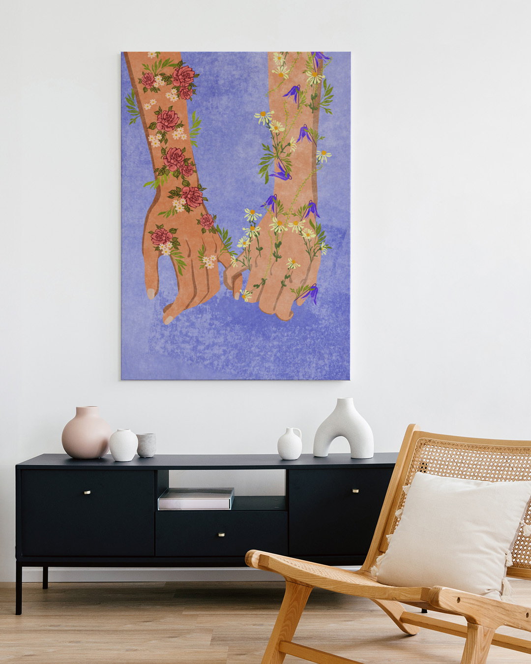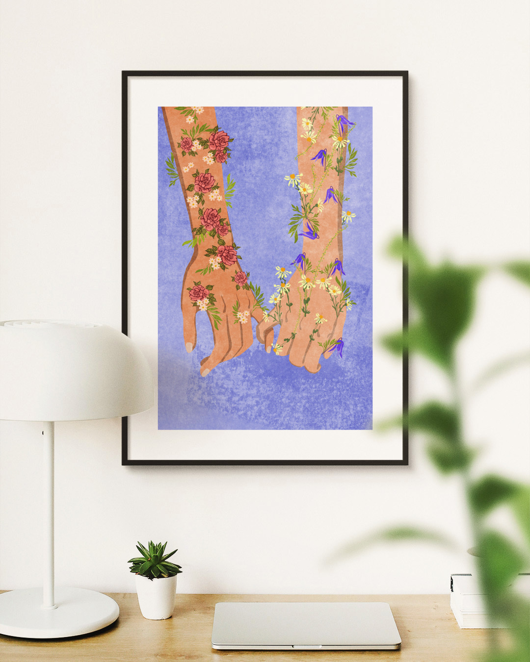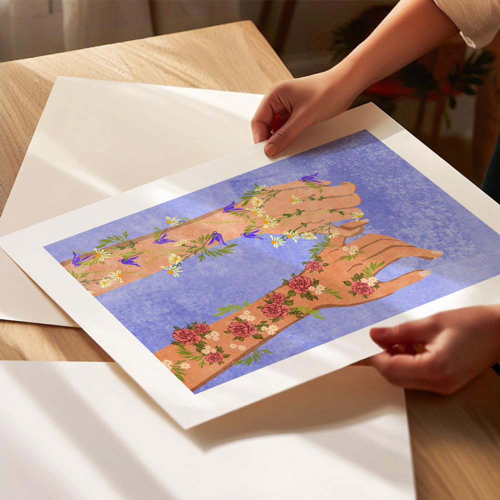 Schöne Illustration von Raissa Oltmanns, die Hände zeigt, die sich mit bunten Blumenmustern auf blauem Hintergrund halten. Perfekt, um einen Hauch von botanischem Charme hinzuzufügen.