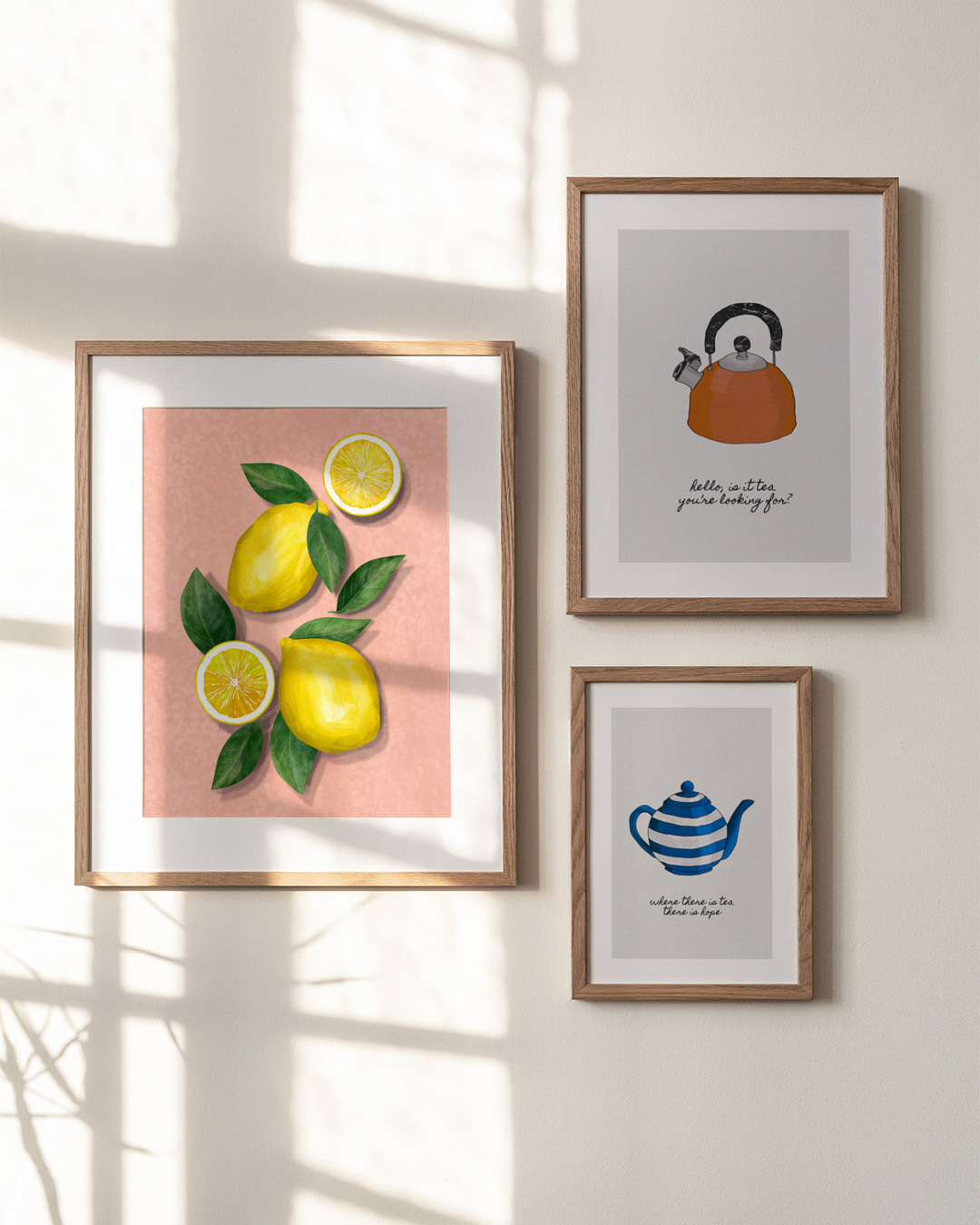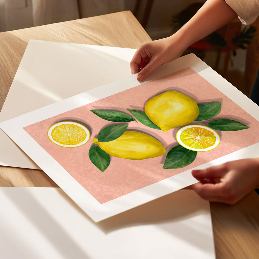 Eine lebendige Illustration von Emelie Bylund, die frische gelbe Zitronen mit reichen grünen Blättern auf einem weichen rosa Hintergrund zeigt. Perfekt, um Ihrer Küche Frische zu verleihen.