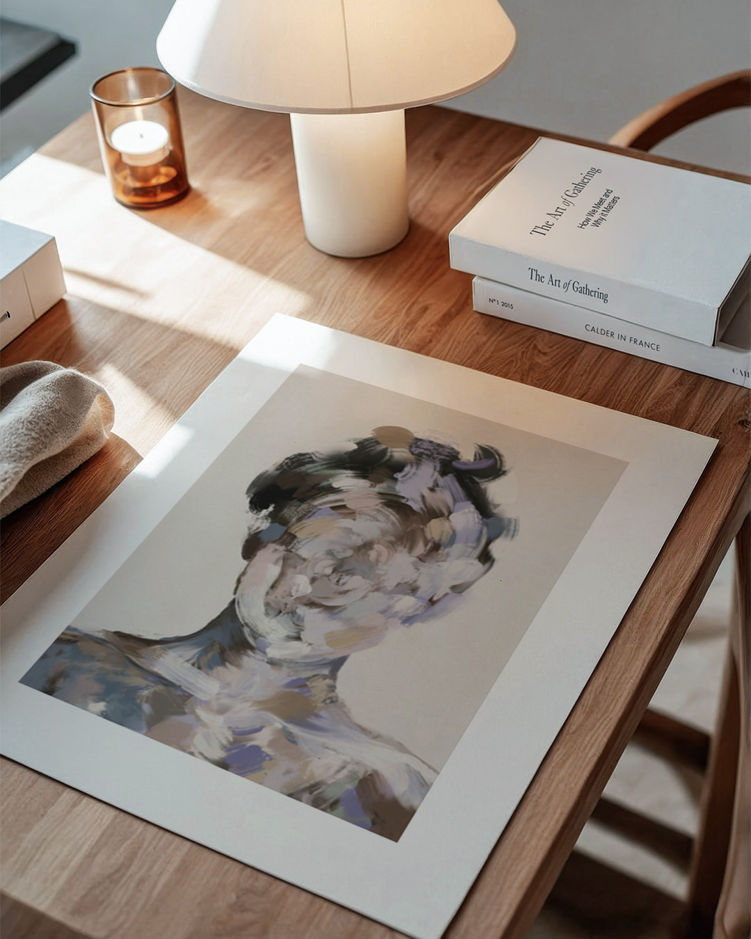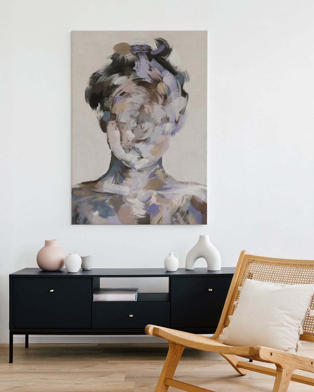 Erkunden Sie die Eindrücke von Identität mit dem faszinierenden Porträt von Gabriella Roberg. Die Pinselarbeit mischt ein menschliches Gesicht in ein Wirbel aus lila und blauen Tönen und schafft eine markante visuelle Erkundung von Formen und Emotionen.