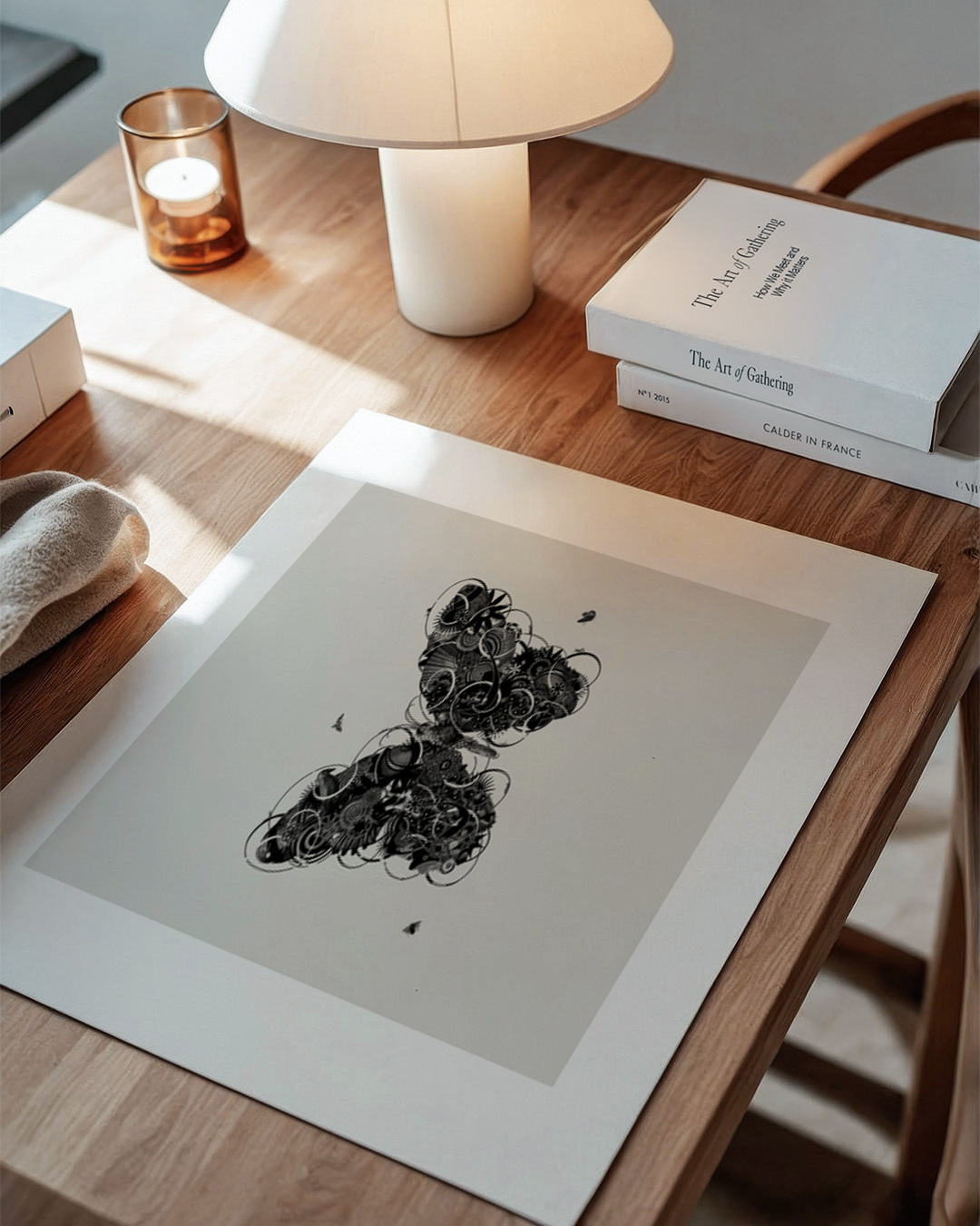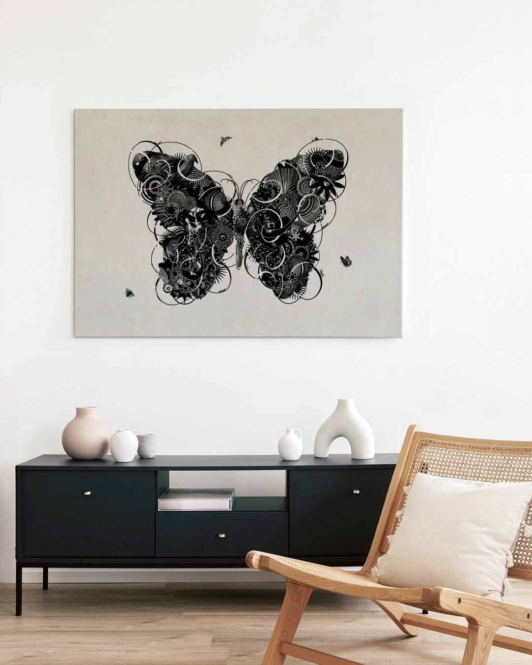 Erkunden Sie die Schönheit von Jaco Putkers komplexem Schmetterlingsdesign. Diese faszinierende Kreation kombiniert filigrane Muster und Texturen in Monochrom und schafft einen einzigartigen visuellen Reiz. Perfekt für Liebhaber detaillierter Kunst.