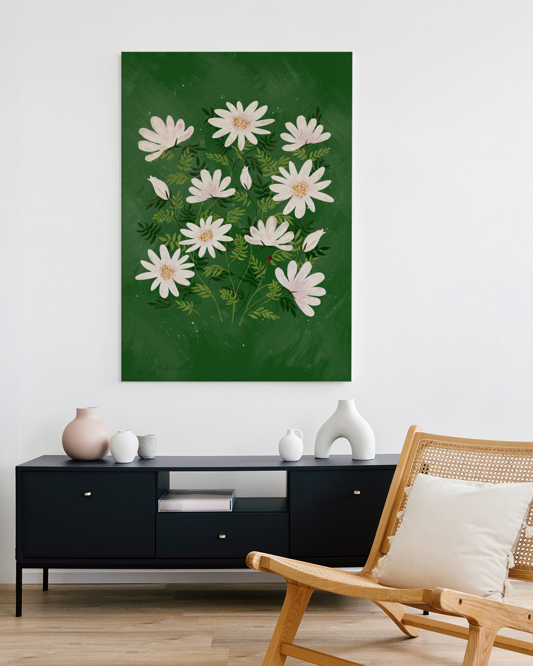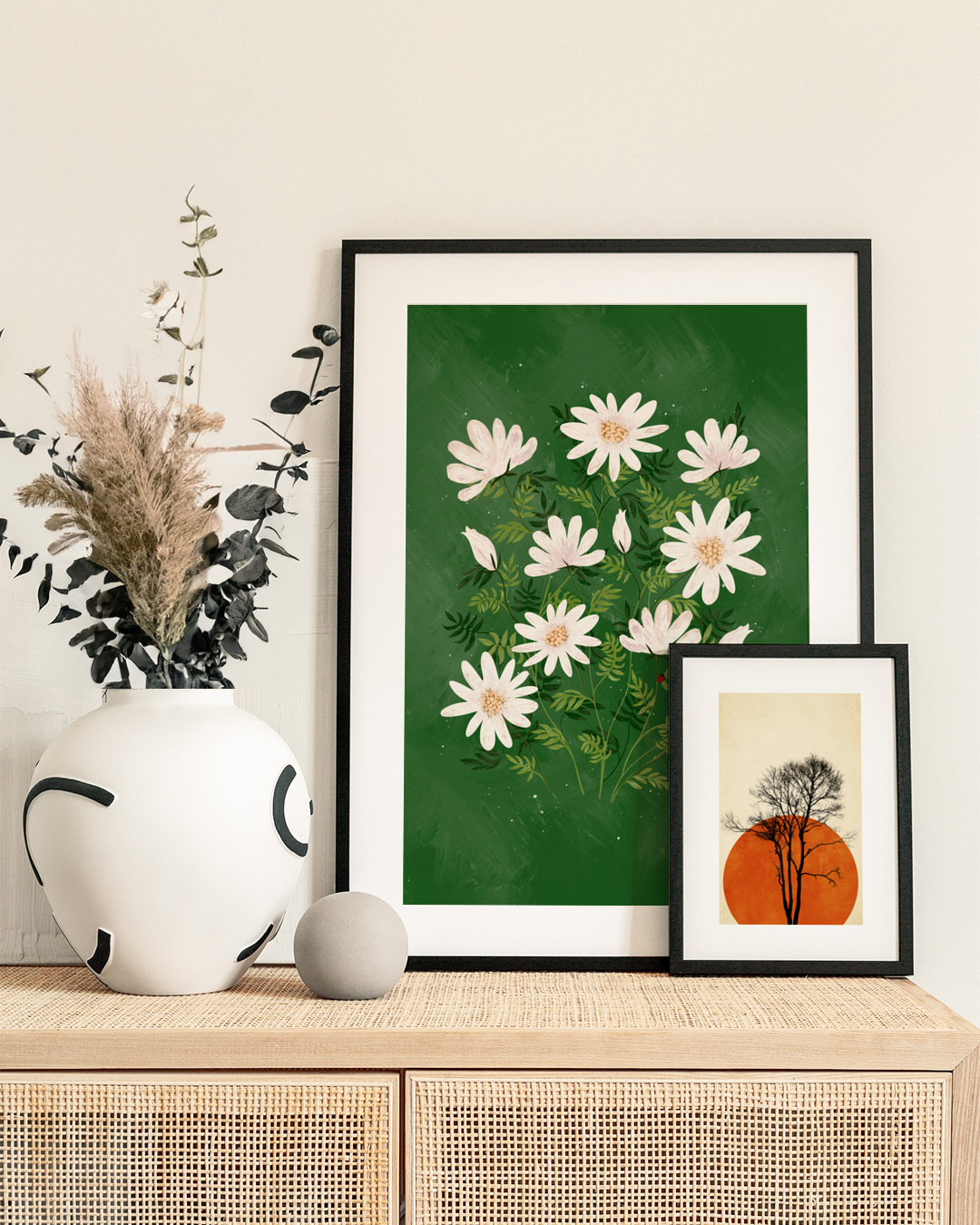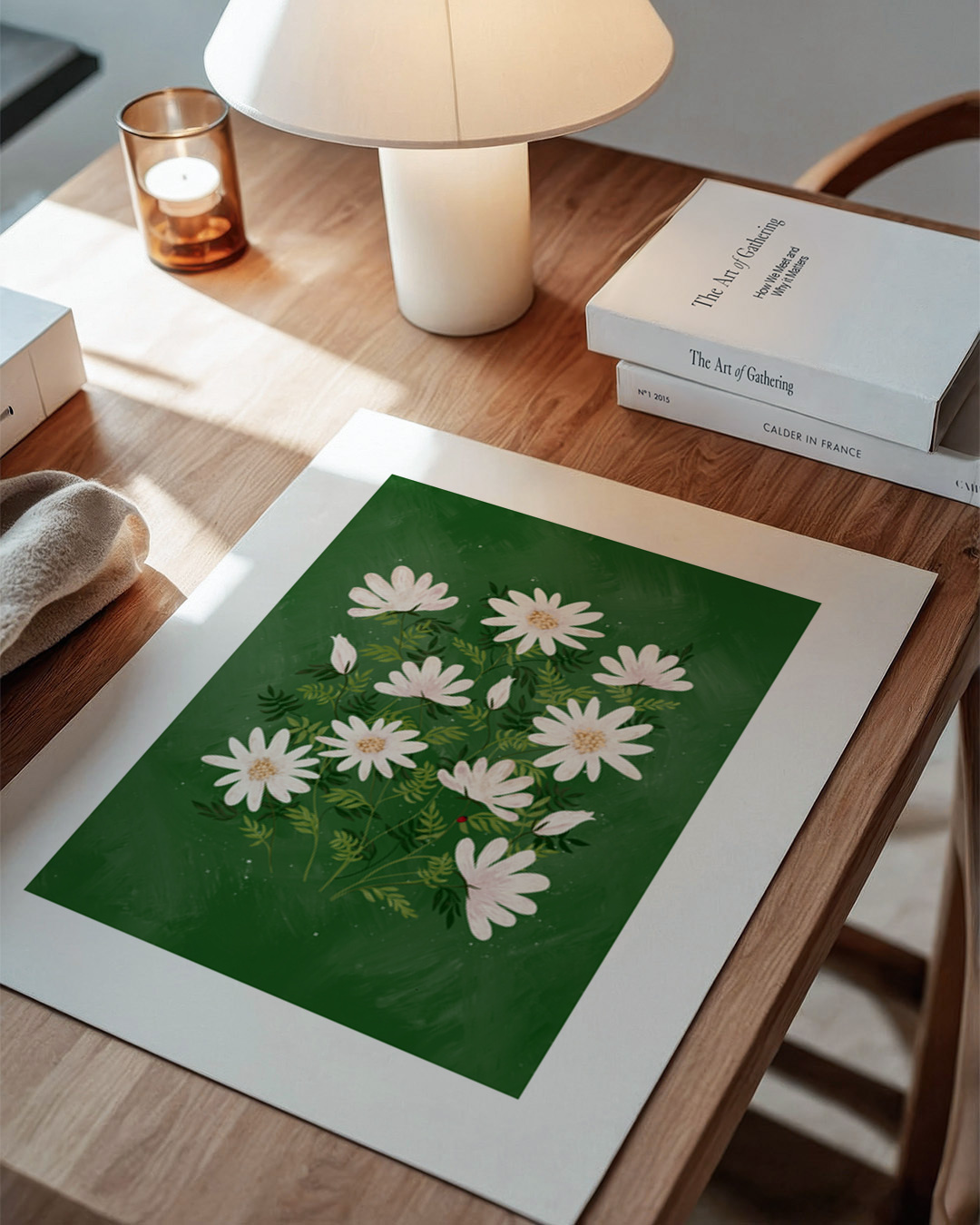 Eine charmante Illustration eines Marienkäfers auf weißen Gänseblümchen vor einem üppig grünen Hintergrund von der Künstlerin Emelie Bylund. Perfekt, um jedem Raum einen Hauch von Natur zu verleihen.