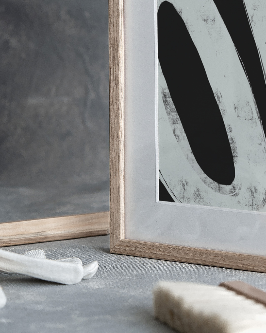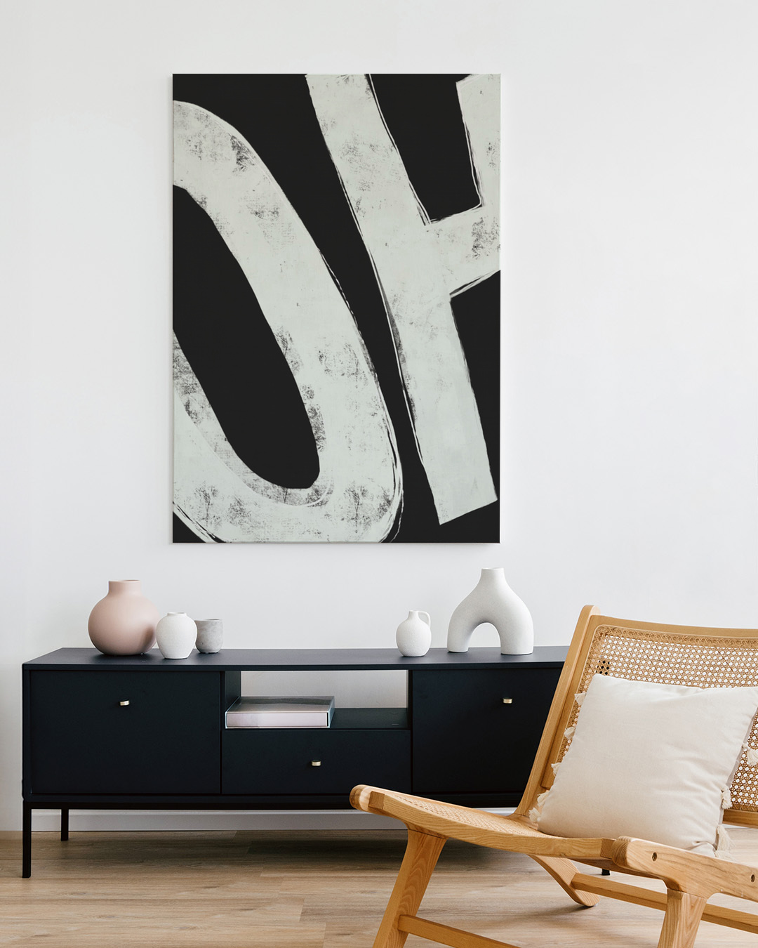Die gespannte Leinwand wird in einen stilvollen Schattenfugenrahmen aus echtem Holz eingefasst, um einen eleganten Look und zusätzliche Dimension zu schaffen. Der Raum zwischen der Leinwand und dem Rahmen erzeugt einen schwebenden Effekt.