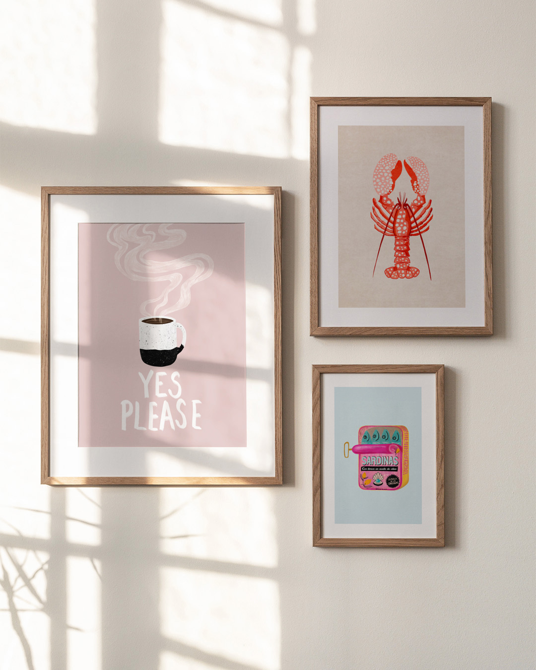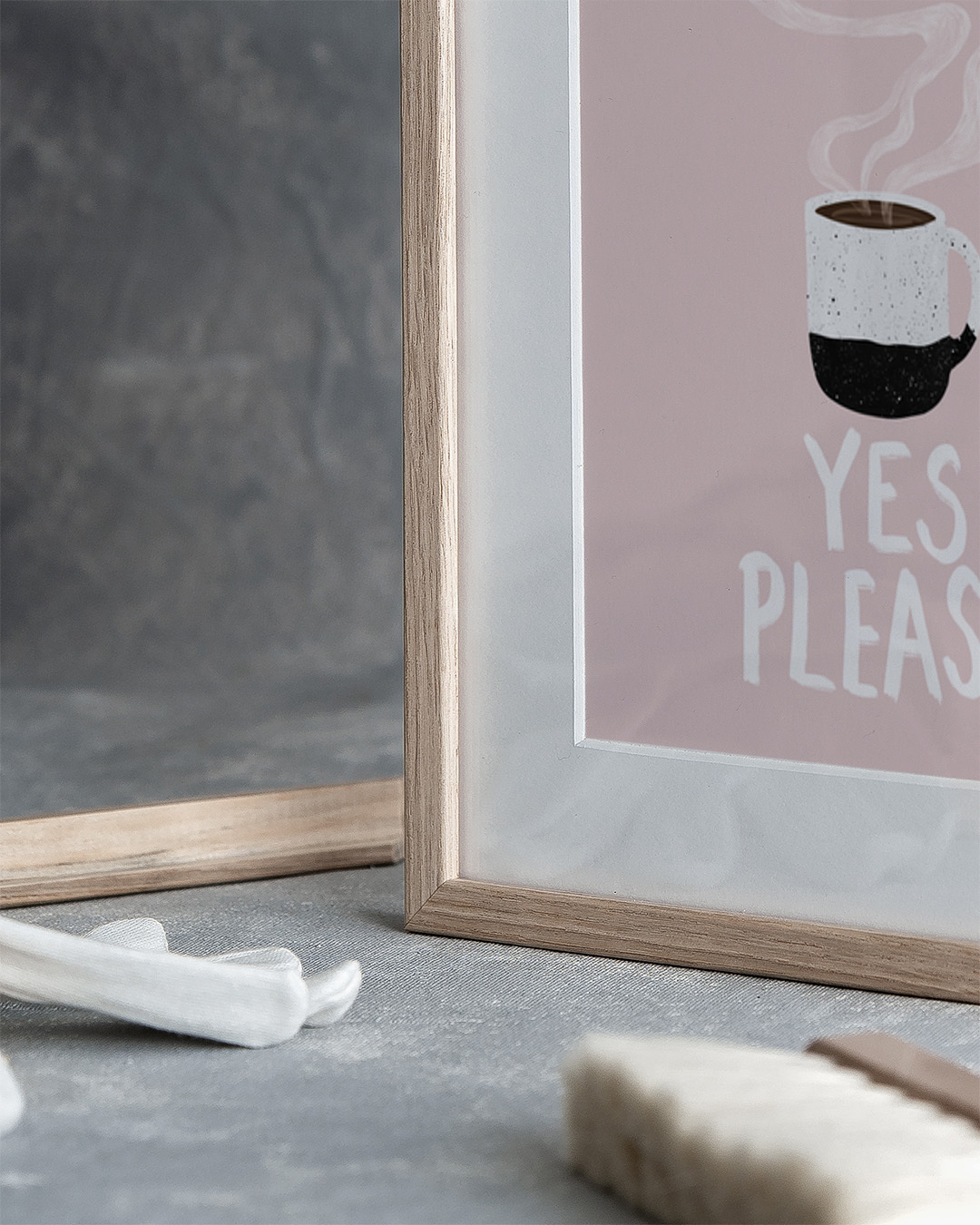 Diese charmante Illustration von Emelie Bylund zeigt eine dampfende Tasse Morgenkaffee mit dem einladenden Text 'Yes Please' auf einem zartrosa Hintergrund. Perfekt, um Ihrer Morgenroutine eine Portion Wärme zu verleihen.