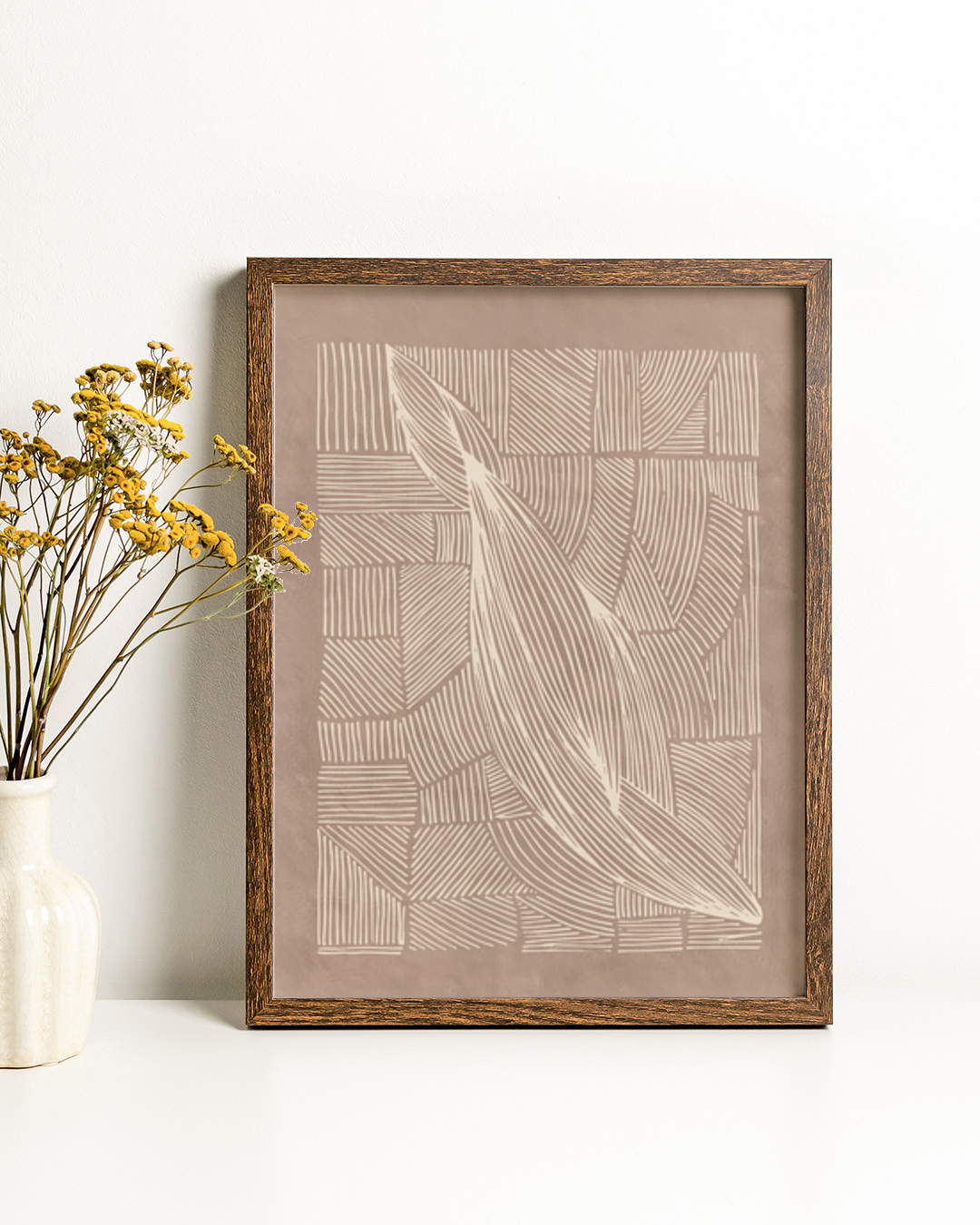 In Lucrecia Caporales Werk bilden beige Linien ein harmonisches Muster auf einem braunen Hintergrund. Perfekt für Liebhaber abstrakter linearer Entwürfe.