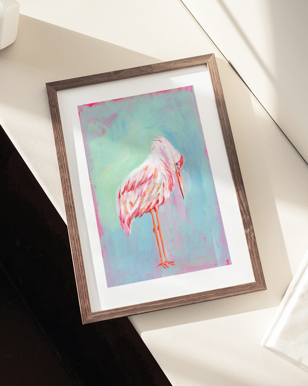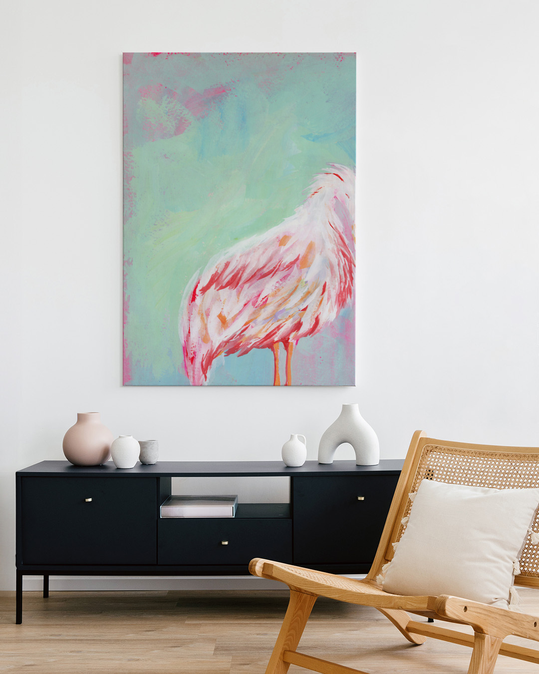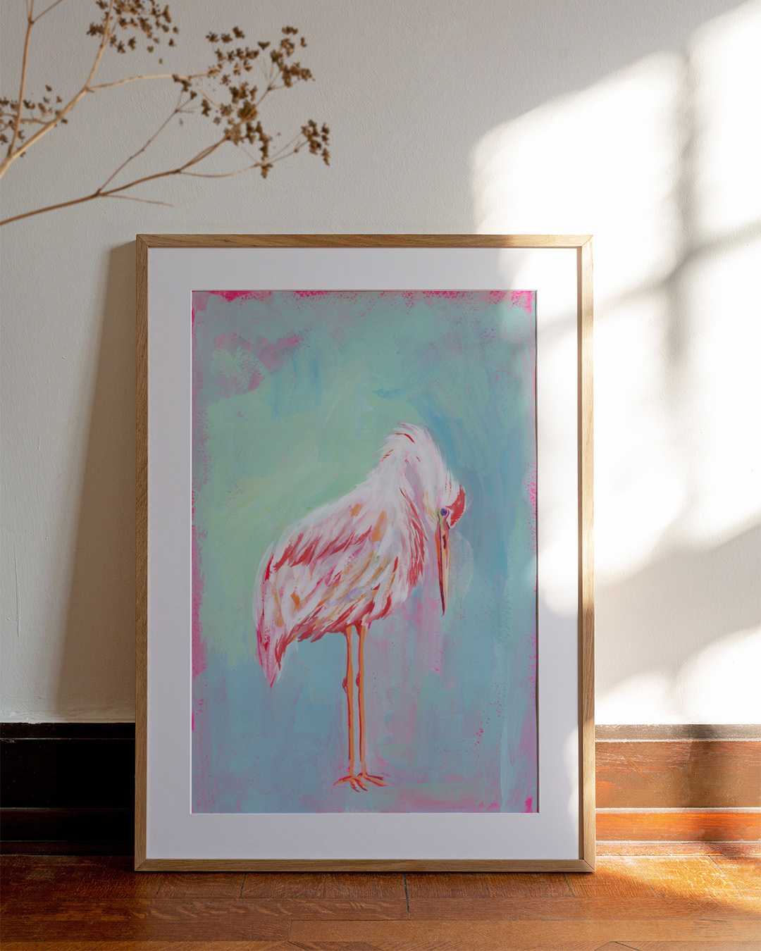 Die gespannte Leinwand wird in einen stilvollen Schattenfugenrahmen aus echtem Holz eingefasst, um einen eleganten Look und zusätzliche Dimension zu schaffen. Der Raum zwischen der Leinwand und dem Rahmen erzeugt einen schwebenden Effekt.