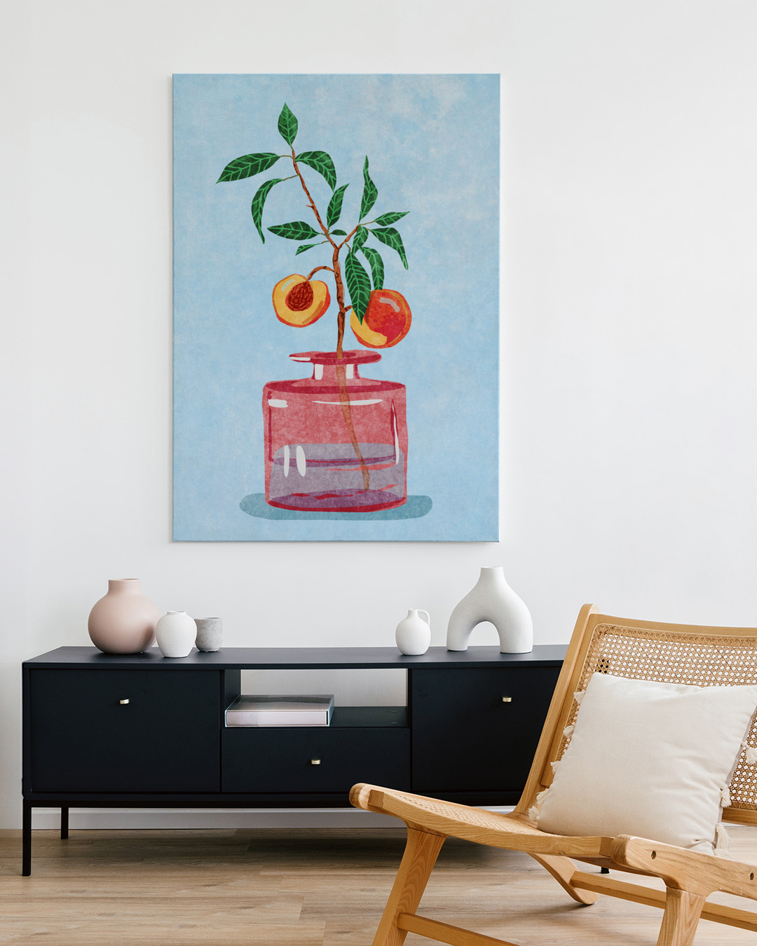 Ein zarter Pfirsichzweig mit reifen Pfirsichen und grünen Blättern in einer einfachen Vase auf einem hellblauen Hintergrund, der die Essenz der botanischen Schönheit einfängt.