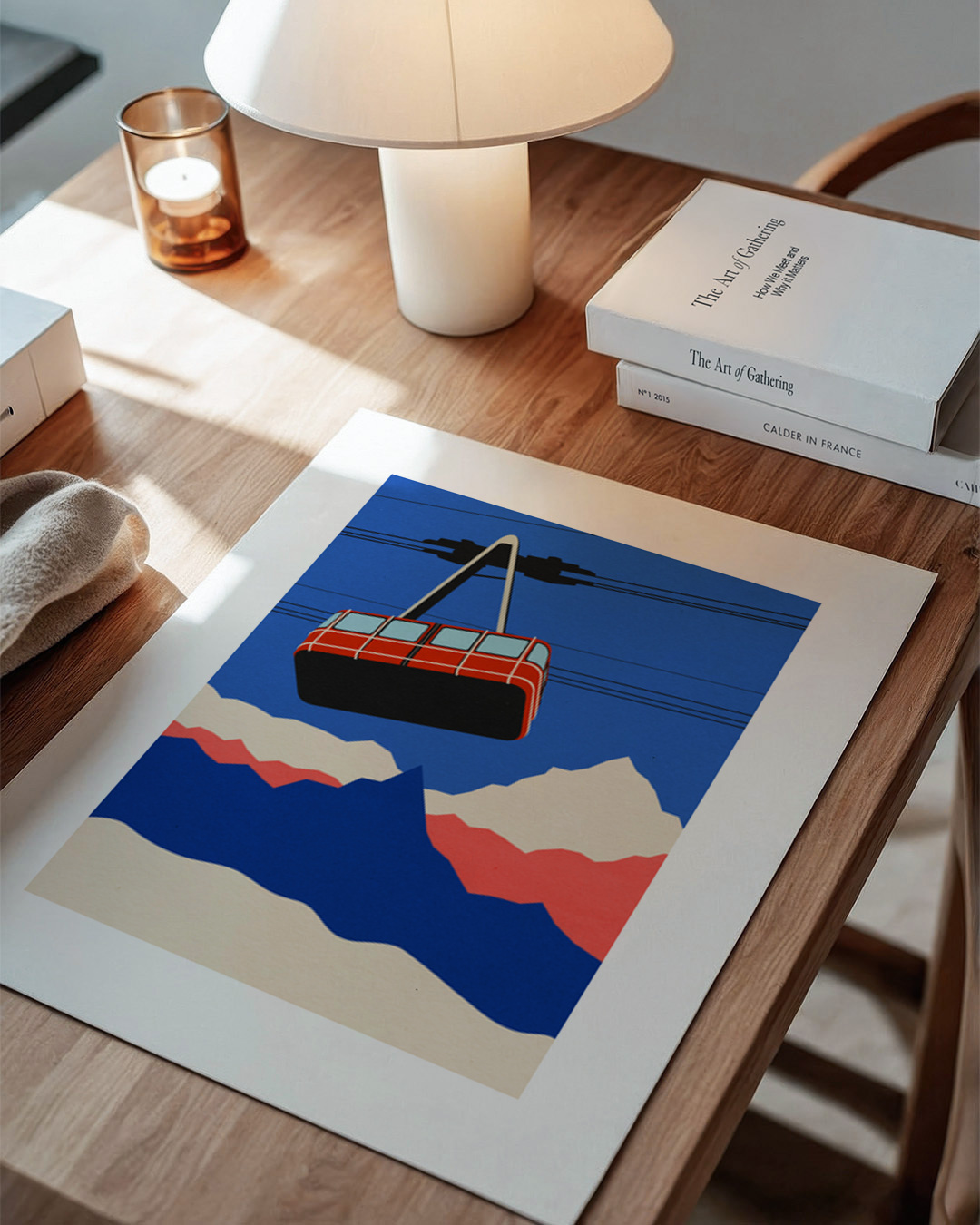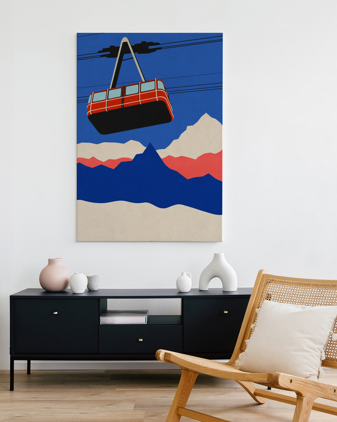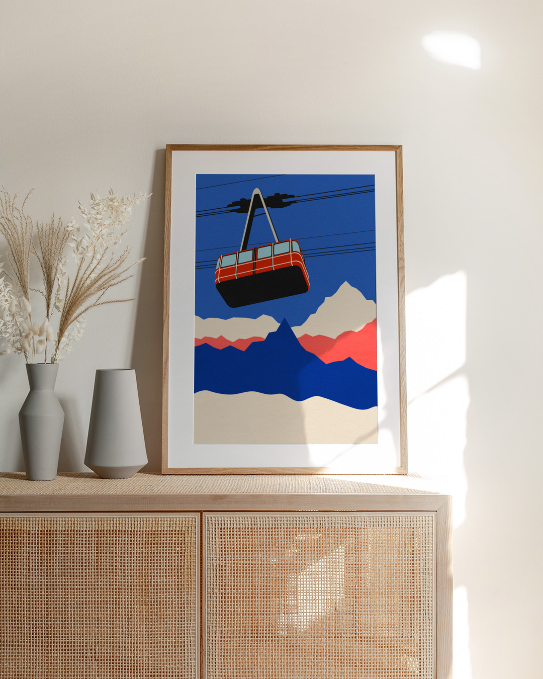 Ein auffälliger Druck mit einer Retro-Seilbahn vor einer Kulisse majestätischer Alpengipfel, hervorgehoben durch lebendige rote und blaue Töne.
