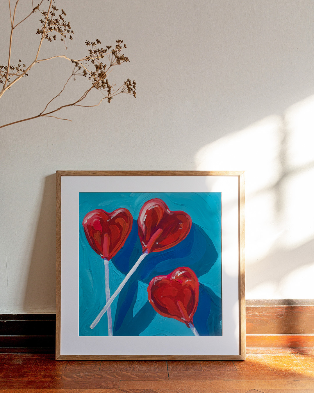 Ein charmantes Gemälde mit roten herzförmigen Lutschern auf einem lebendigen blauen Hintergrund. Ideal für Liebhaber süßer Leckereien und verspielte Kunst.