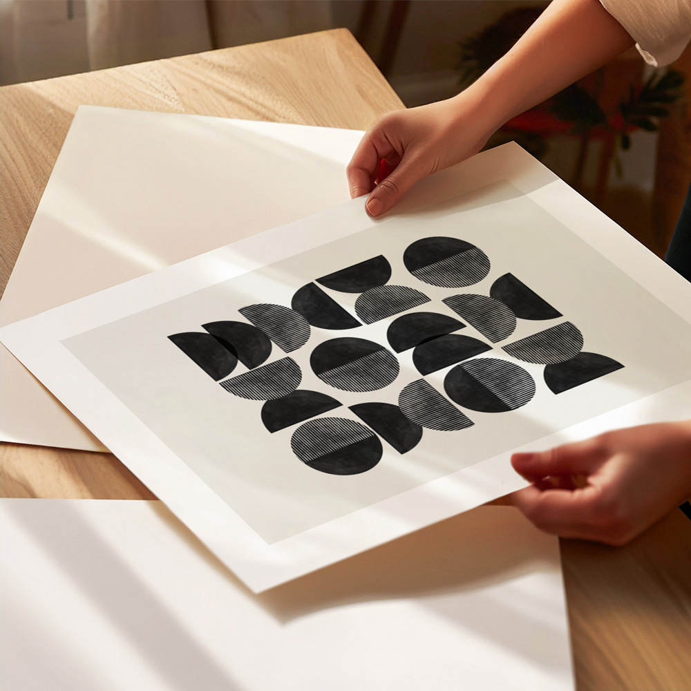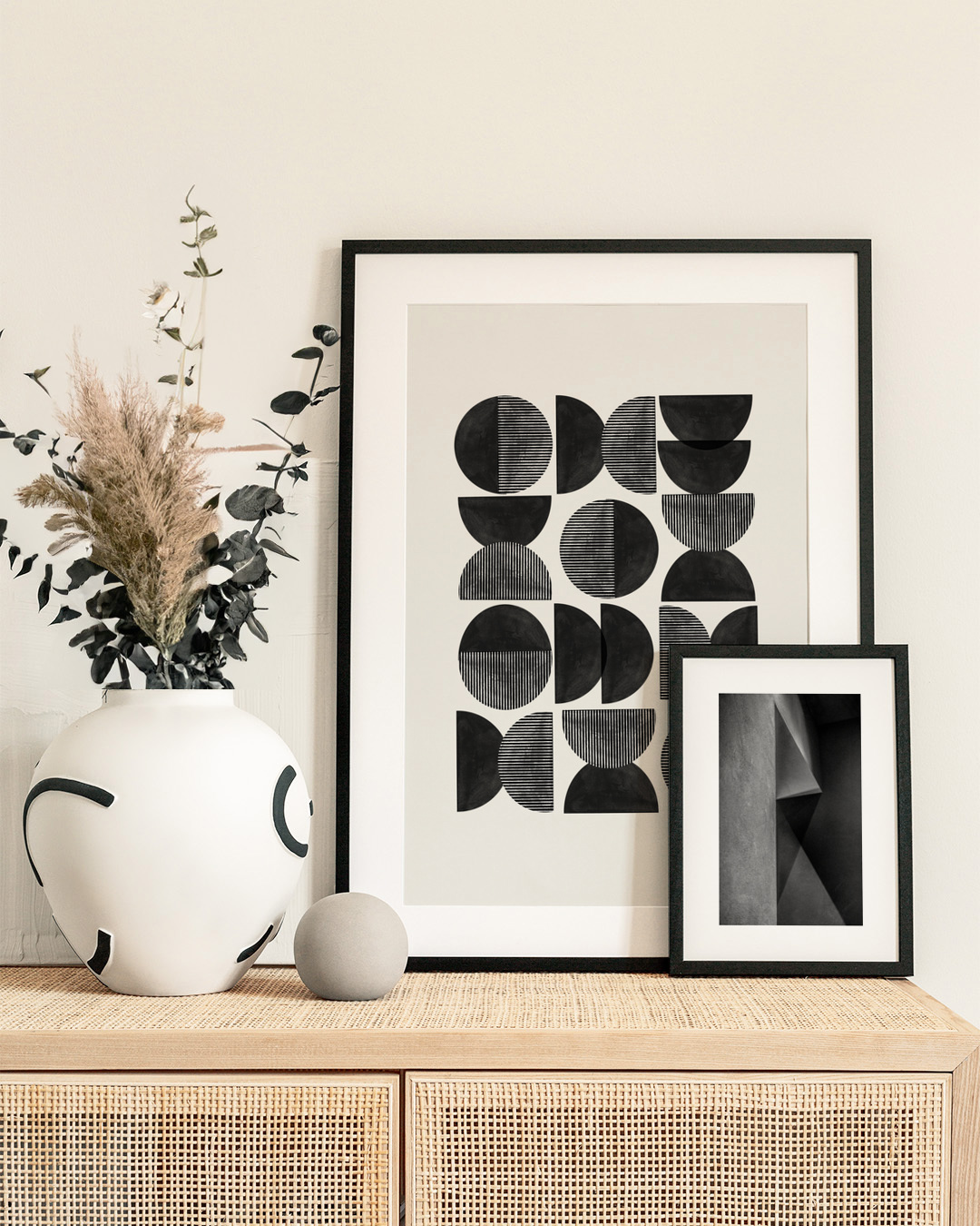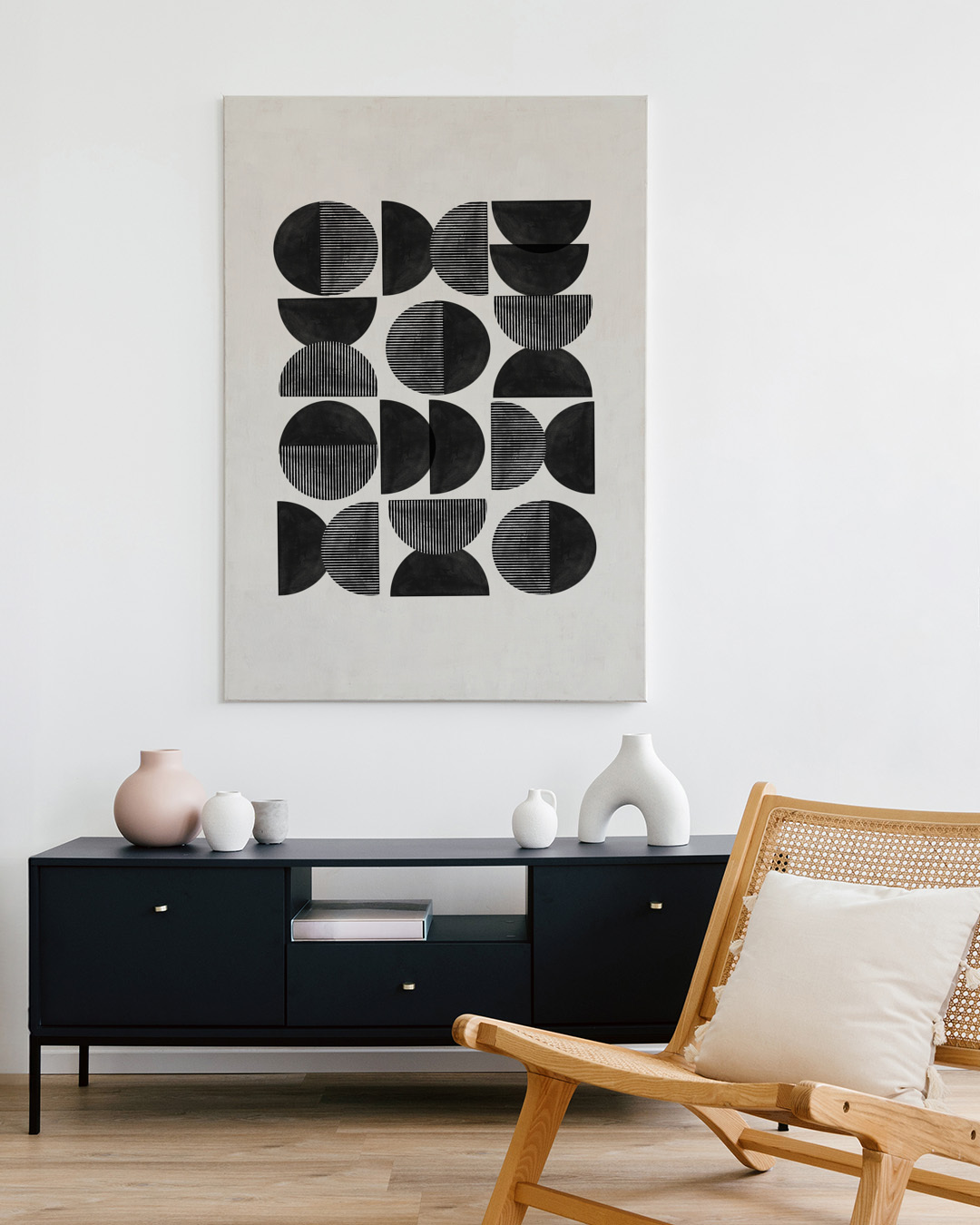 Entdecken Sie die Eleganz der monochromen Geometrie mit konzentrischen Mustern und einzigartigen Formen in diesem markanten Design von Miuus Studio.